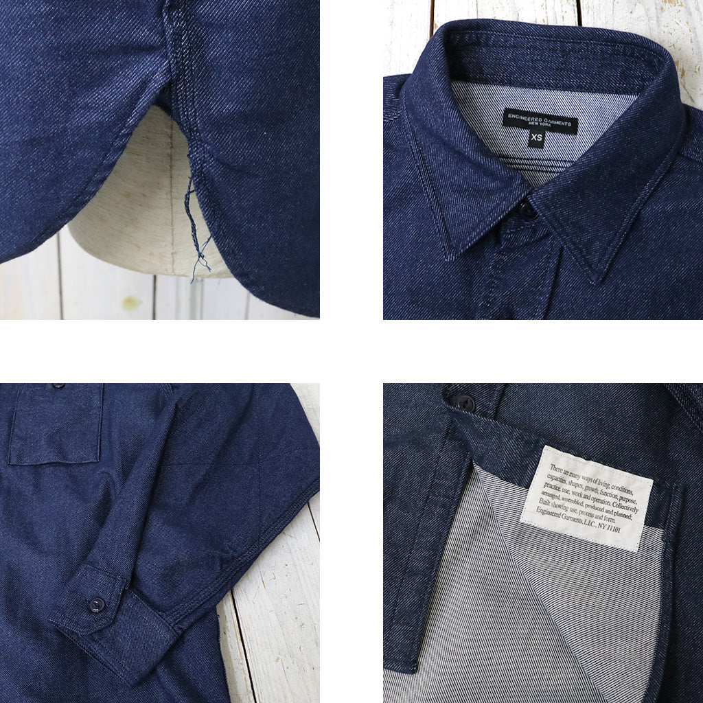 ENGINEERED GARMENTSの定番のワークシャツです。コットンデニムフランネル生地を使用し、胸ポケットは左右でデザインが異なり、肩や袖ぐり、脇はトリプスステッチで縫製され、肘の当て布やサイドのガゼット、カンヌキステッチなどワークなディテールがふんだんに盛り込まれています。