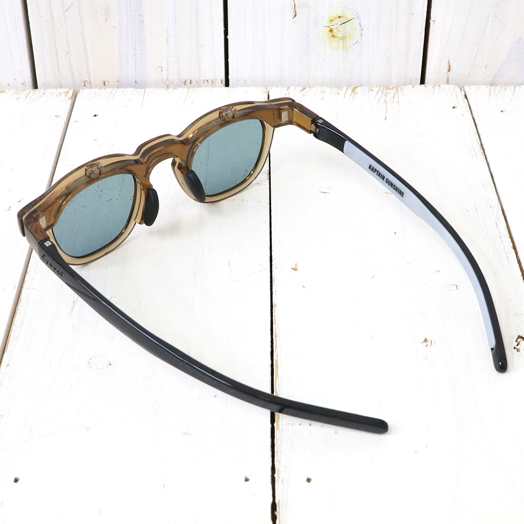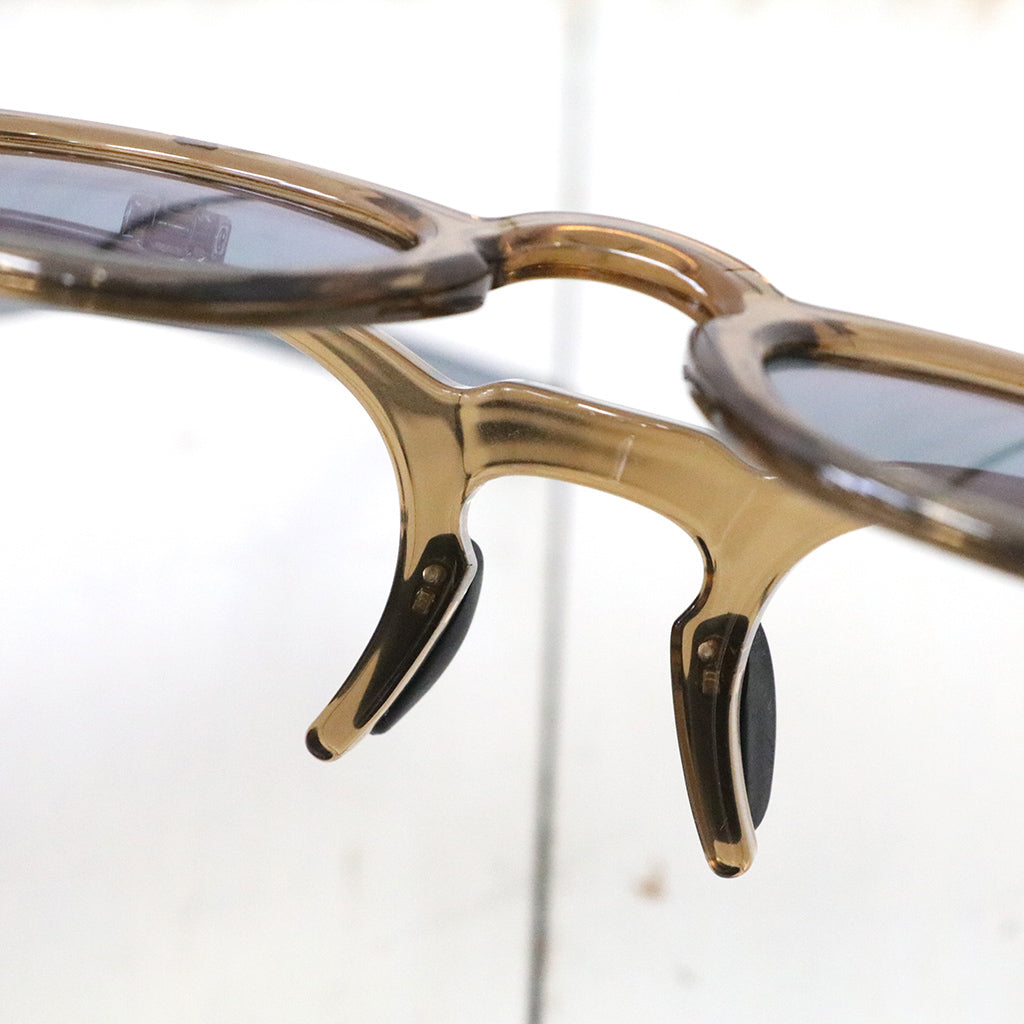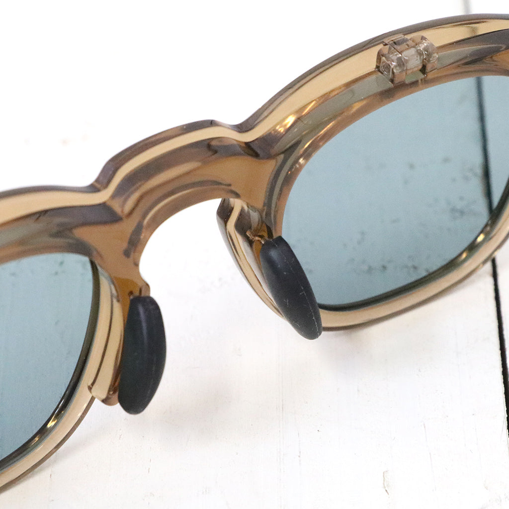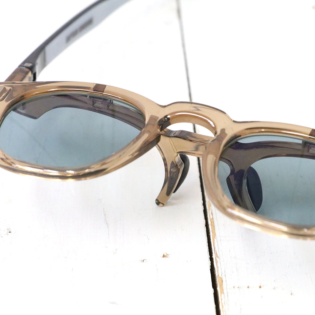 Kaptain Sunshine×EYEVOLのコラボレーション サングラスです。フレンチヴィンテージをアレンジしたクラシックな跳ね上げのデザインで、軽く、強度の高い素材「TR-90(ポリアミド樹脂)」で、細かいパーツを構成、緩みにくいオリジナル丁番パーツを跳ね上げコマ部分に採用することで、安定した開閉を実現し、一般的なFLIP UPのサングラスより重い、破損しやすいなどデメリットが発生しにくい設計です。