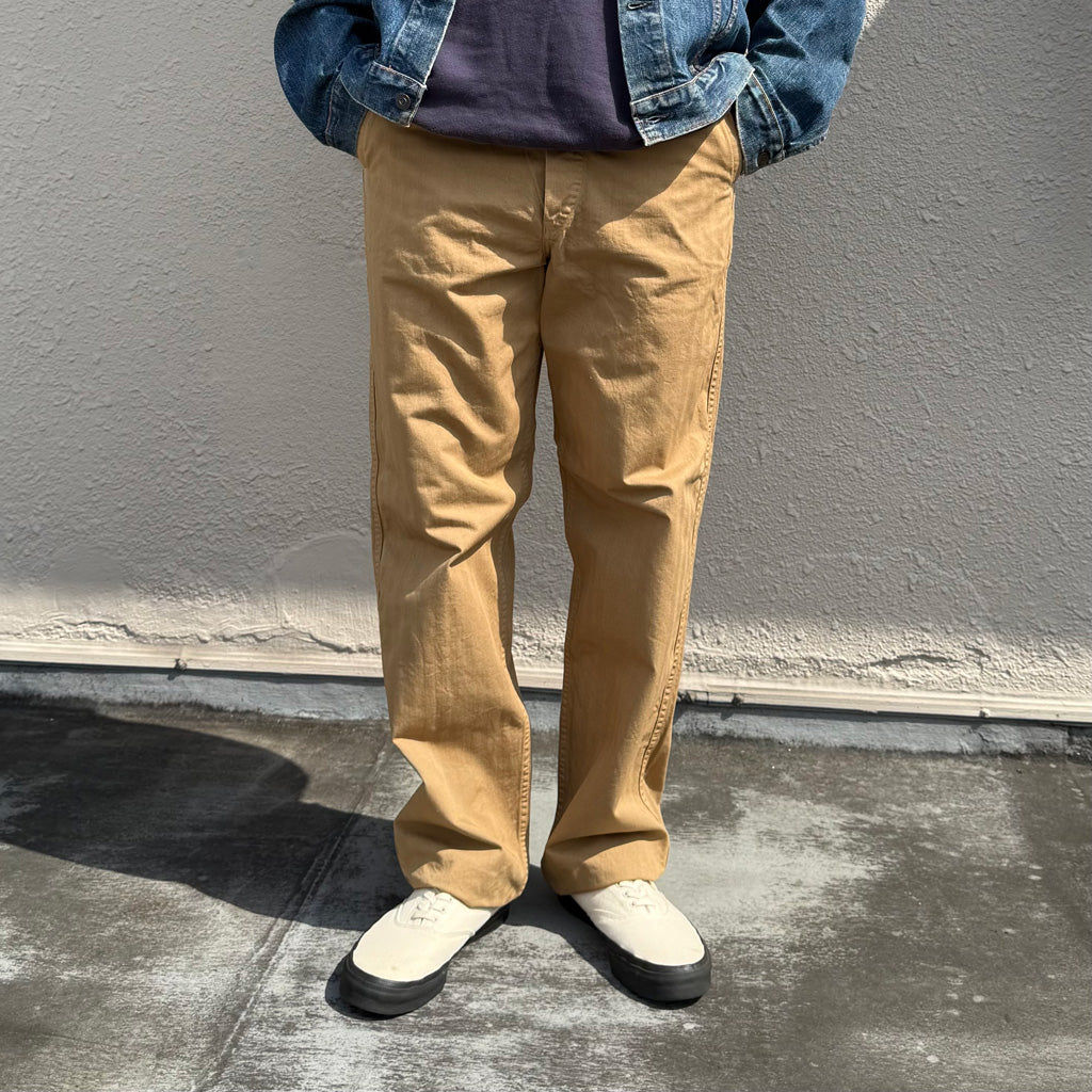 コットン素材のヘリンボーンツイル生地を使用したワークパンツです。程よいゆとり感のあるシルエットで、ウエストはベルトループもありますがゴムも入っているのでイージーパンツのような作りで、フロントはボタンフライ仕様になっています。生地は洗い加工された柔らかい肌触りで、厚すぎず、薄すぎない生地なのでオールシーズン活用できます。合わせる靴によってロールアップしてアクセントを付けたりとコーディネートしやすい万能パンツです。