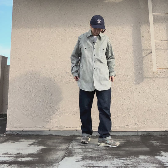 6ozヒッコリー生地を使用した定番ワークシャツです。SASSAFRASらしいポケットデザインがアレンジされた一枚で、フロントボタンは70~80年代のシャツの6つボタンを採用し、両胸のポケットの他に両サイドにもポケットが配置されています。脇下にはマチがあり腕が動かしやすい作りで、タフなワークシャツです。