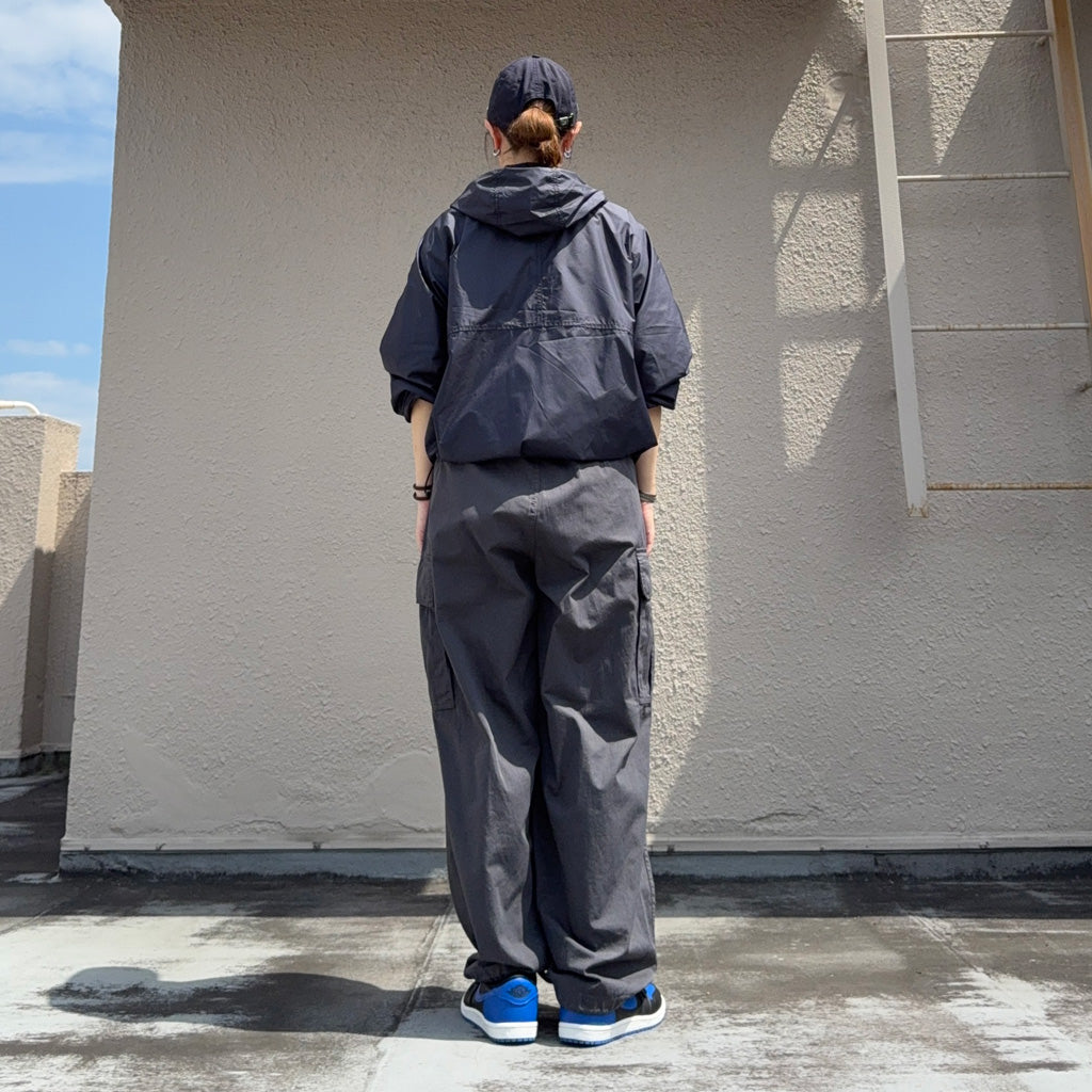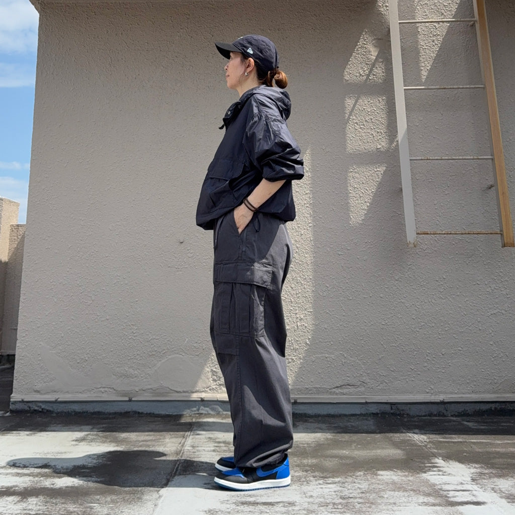 コットンナイロンリップストップ生地を使用したカーゴパンツです。オーガニックコットンとリサイクルナイロンの混紡糸で織られた生地は、タフな素材感と軽い着心地が特徴です。形は70年代のBDUパンツをベースに、ハンティングパンツやクライミングパンツなどのディテールをミックスし、ウエストはウェービングベルト仕様、股下には脚の可動域を大きくするマチ付きで、ワタリ広めのワイドストレートシルエットです。