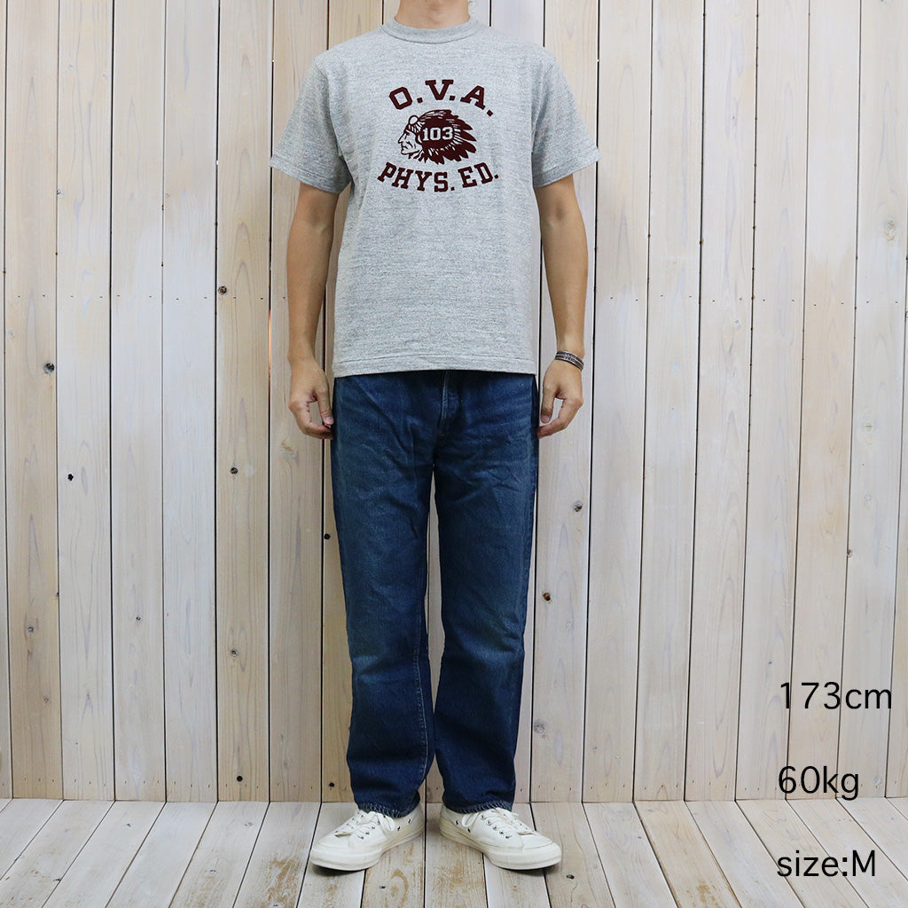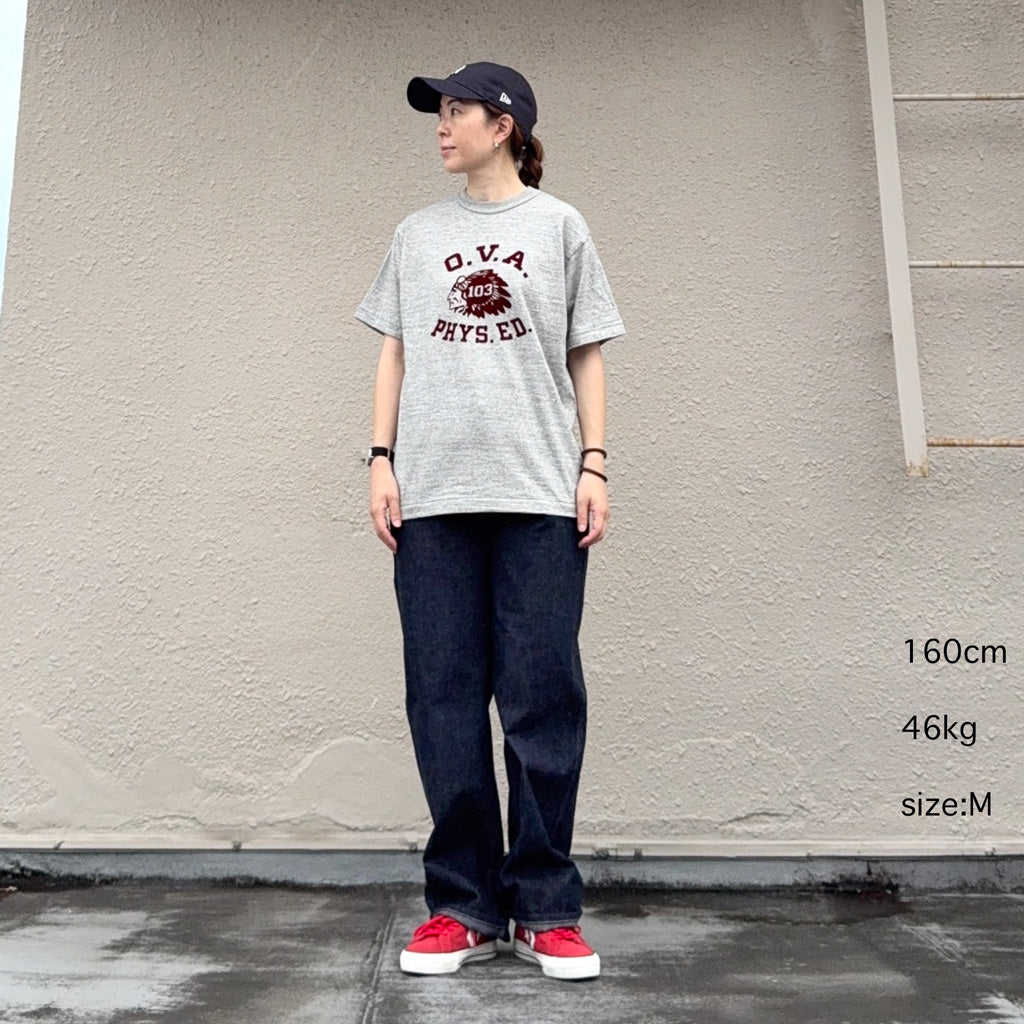 「吊り編み機より希少」といわれる旧式のローゲージ編み機で編まれたウエアハウスの定番Lot 4601のプリントTシャツです。12番のムラ糸で独特の陰影が出るように編まれたこの生地はシャドウボーダーと呼ばれており、無地でありながらうっすらと横段のようなムラが浮かびます。極端に前下がりの現代的なネックラインではなく、フライスにパイピングを噛ませる事で強度を保ちながら、着込むほどにネックラインが緩み自然な前下がりが生じてきます。フロントにフロッキープリントが施されています。