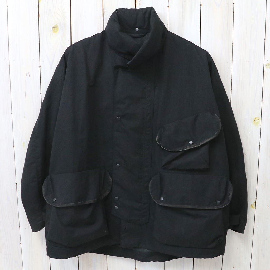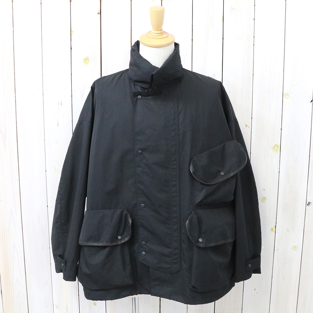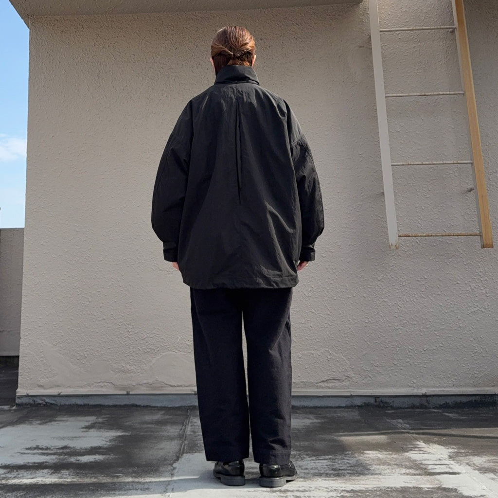 タテ糸にコットン、ヨコ糸にナイロンを使い超高密度に織り上げたコットンナイロンツイル生地を使用したハンタージャケットです。撥水加工も施され、味わい深いドレープがとてもエレガントな作りで、フロントに配置されたマチ付きの大きな3つのフラップポケットと長めのスタンドカラーが特徴的なデザインです。背中中央にプリーツが設けられています。ゆったりとしたフィット感の一着です。