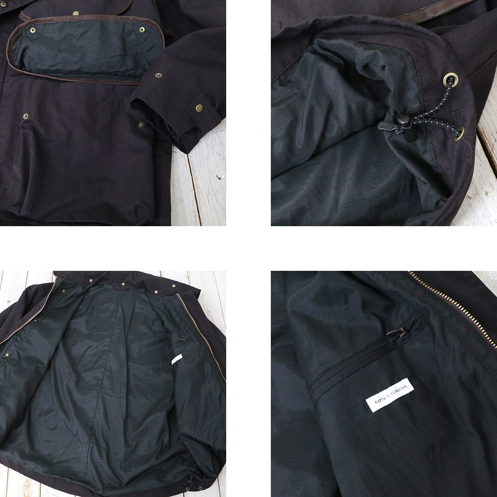 タテ糸にコットン、ヨコ糸にナイロンを使い超高密度に織り上げたコットンナイロンツイル生地を使用したハンタージャケットです。撥水加工も施され、味わい深いドレープがとてもエレガントな作りで、フロントに配置されたマチ付きの大きな3つのフラップポケットと長めのスタンドカラーが特徴的なデザインです。背中中央にプリーツが設けられています。ゆったりとしたフィット感の一着です。