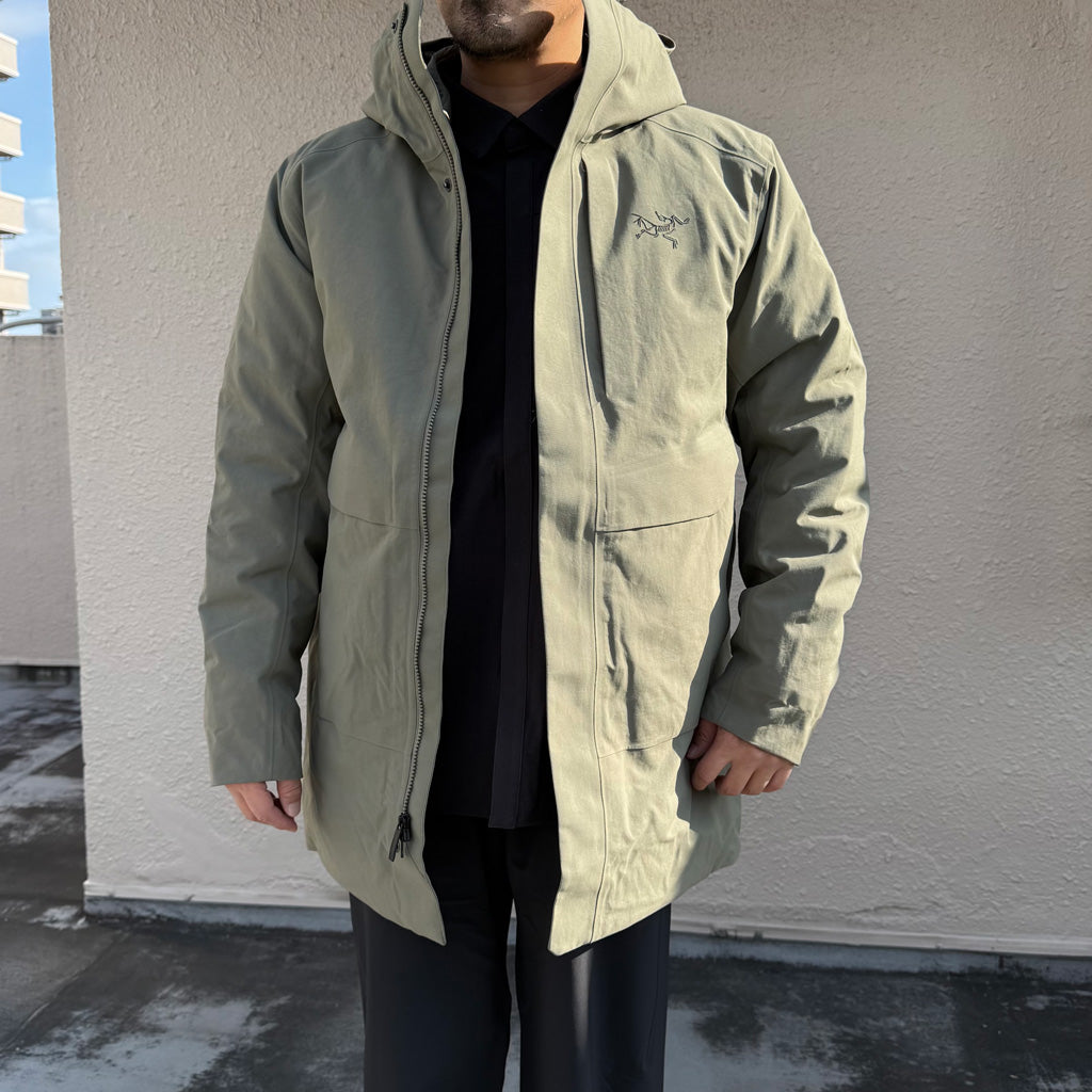 軽量で耐久性があり、極寒で雨の多いコンディションにも対応するサーミーラインの防水ダウンパーカーです。表地の2L GORE-TEXは、耐久性に優れた耐候性を備えたリサイクルナイロンを使用しています。キャンバスのような表情で、より頑丈なルックスを実現しています。また耐久性撥水加工により、水分を弾きます。