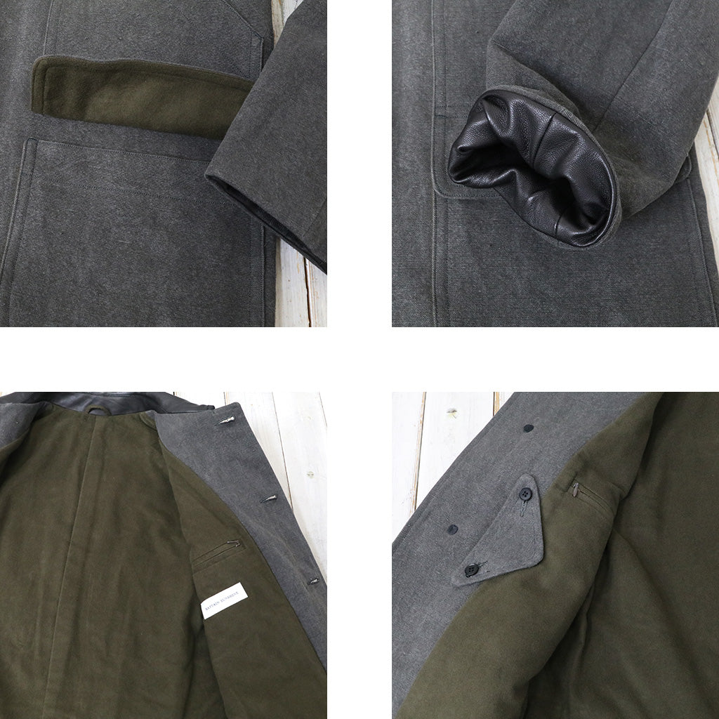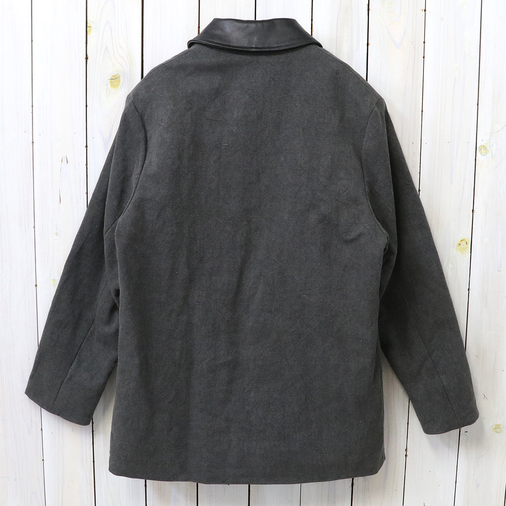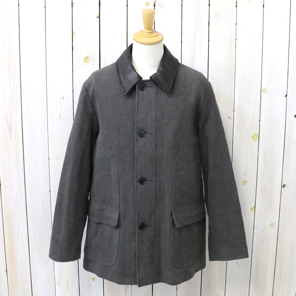 タテ糸にコットン、ヨコ糸にヘンプの太番手を使用し、高密度に織ったヘビーオックスフォード生地を使用したワークコートです。仕上げに何度も洗い込んで膨らみを持たせており、日本の伝統的な染料の墨で染めあげ、さらに洗いこむ事でまるでヴィンテージのような仕上がりになっています。襟と袖口裏にシープレザーを組み合わせ、アクセントとなった一着です。