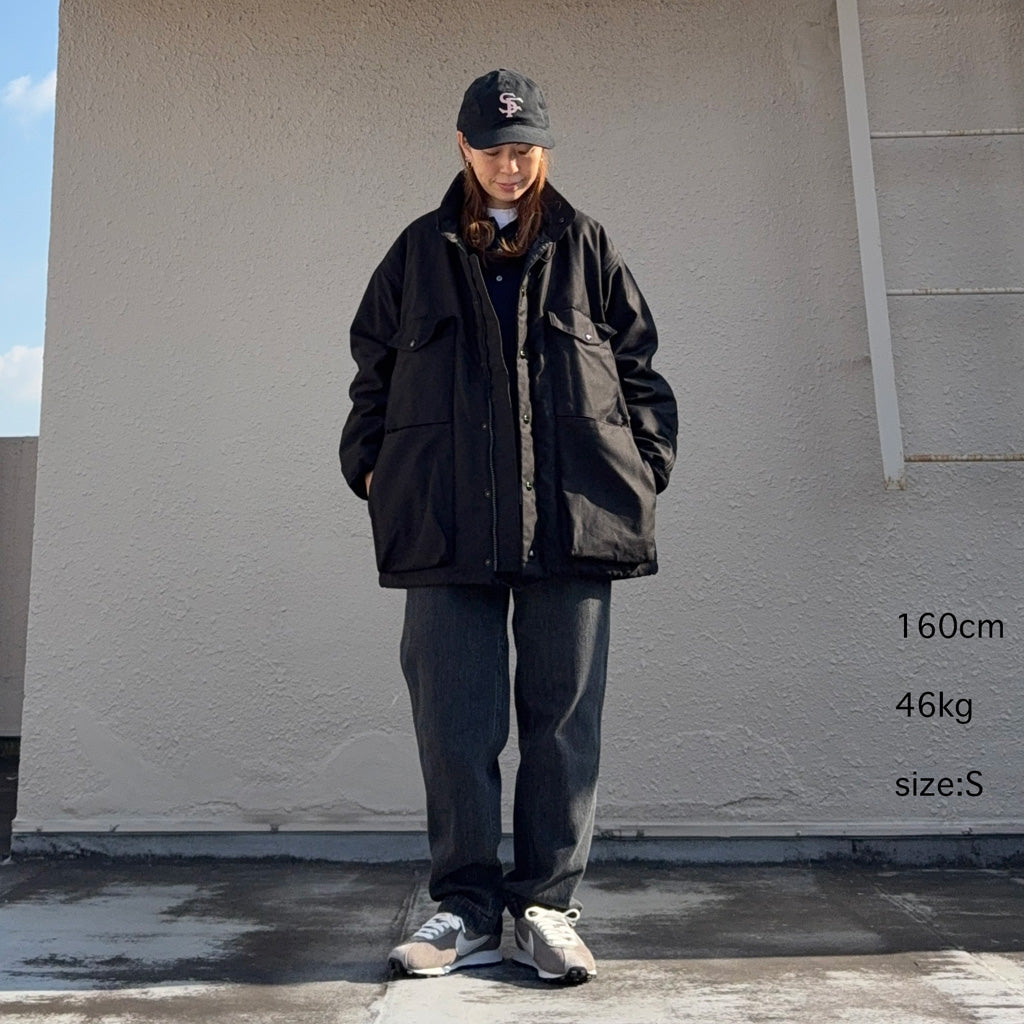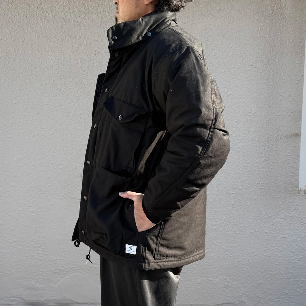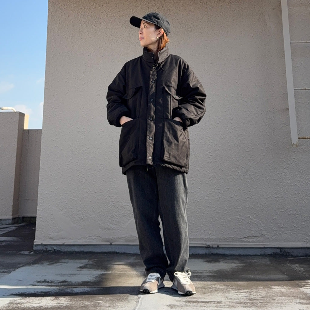 バックサテン生地を使用した新作インサレーションジャケットです。定番のDIGS CREW JACKETをベースにし、M-65をアレンジしたデザインです。襟はスタンドカラーで、フードが収納されています。フロントポケットは上からと横からの2通りの入れ方ができるそれぞれ別のポケットが左右にあり、バック側も3つの仕切りがされた大きいポケットが配置されています。袖口はリブ仕様で、中わたが入っているので保温力があり、身幅はややゆったりとし、ざっくり羽織れる一枚です。