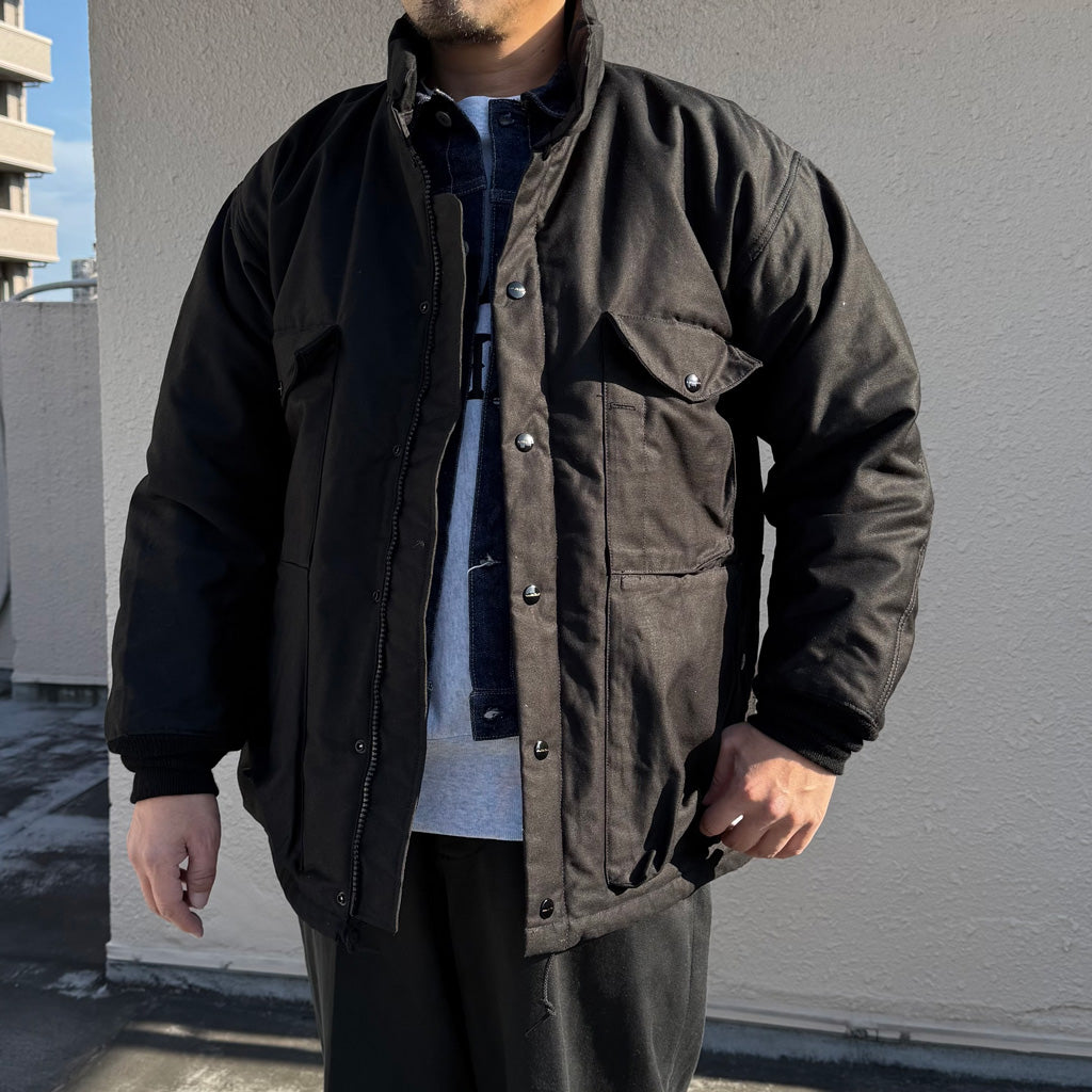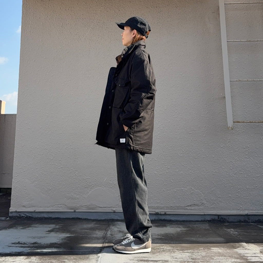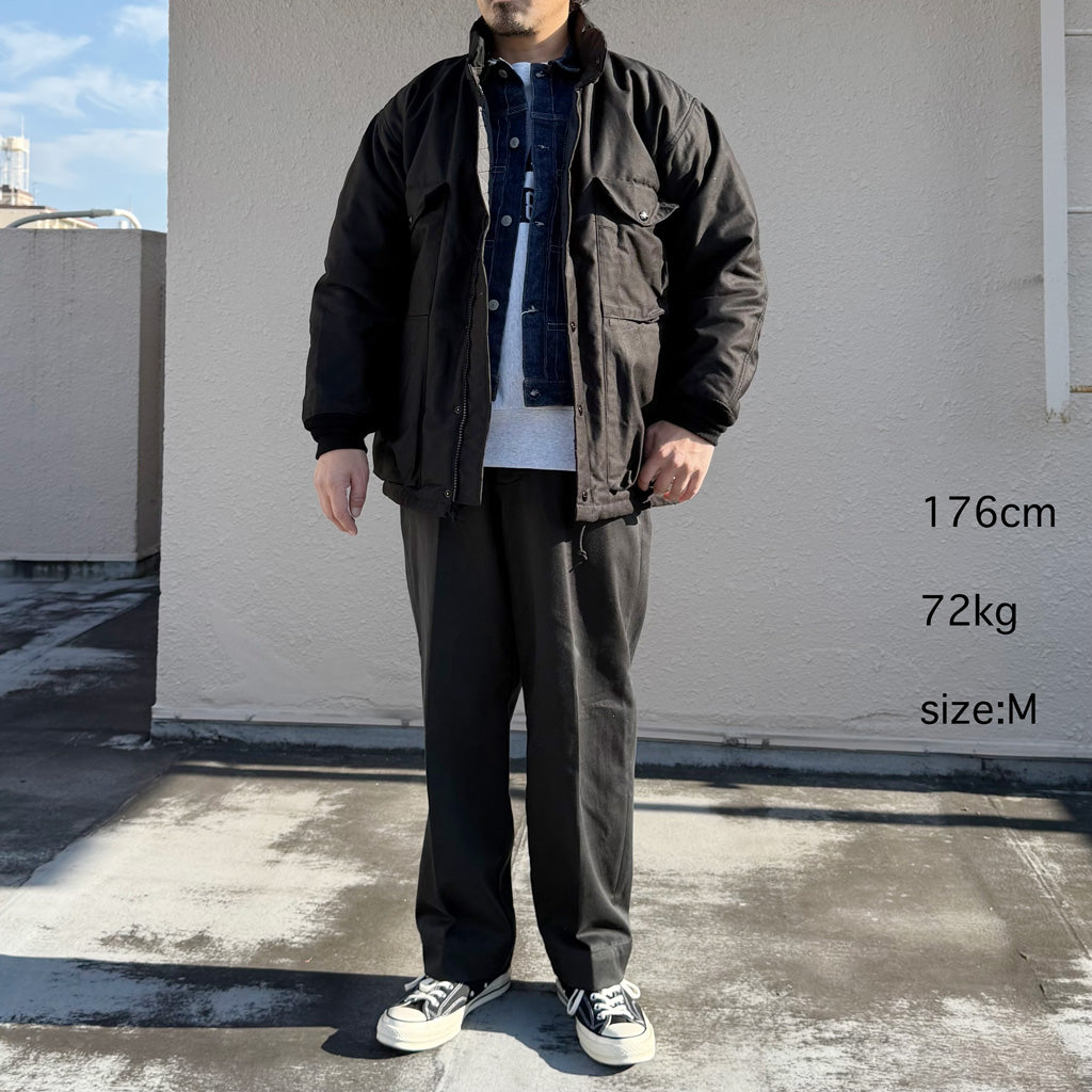 バックサテン生地を使用した新作インサレーションジャケットです。定番のDIGS CREW JACKETをベースにし、M-65をアレンジしたデザインです。襟はスタンドカラーで、フードが収納されています。フロントポケットは上からと横からの2通りの入れ方ができるそれぞれ別のポケットが左右にあり、バック側も3つの仕切りがされた大きいポケットが配置されています。袖口はリブ仕様で、中わたが入っているので保温力があり、身幅はややゆったりとし、ざっくり羽織れる一枚です。