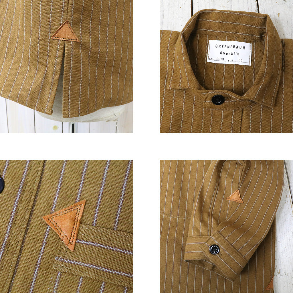 直線的なシルエットのプルオーバーで、当時はワークウエアとしても主流であったプルオーバー型は、そのパターンも直線的なものであり、このグリーンバウムの生地も非常にマッチしていたと考えらます。オールシングル(本縫い)で仕上げられたディテールも特徴で、脇マチとして補強に使用されたレザー、さらにはポケット裏には背広の袖裏のようなストライブ生地が袋布に使用されていたが、それらも徹底して再現しています。グリーンバウムはデニムだけでなく、早くからこのような特徴のある生地を展開していました。