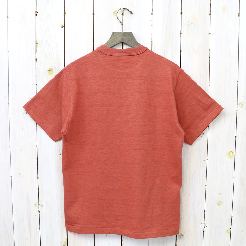 「吊り編み機より希少」といわれる旧式のローゲージ編み機で編まれたウエアハウスの定番Lot 4601のプリントTシャツです。12番のムラ糸で独特の陰影が出るように編まれたこの生地はシャドウボーダーと呼ばれており、無地でありながらうっすらと横段のようなムラが浮かびます。極端に前下がりの現代的なネックラインではなく、フライスにパイピングを噛ませる事で強度を保ちながら、着込むほどにネックラインが緩み自然な前下がりが生じてきます。