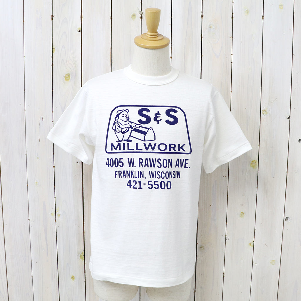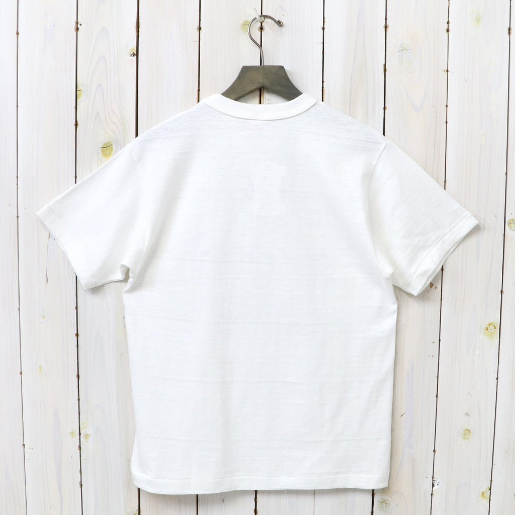 「吊り編み機より希少」といわれる旧式のローゲージ編み機で編まれたウエアハウスの定番Lot 4601のプリントTシャツです。12番のムラ糸で独特の陰影が出るように編まれたこの生地はシャドウボーダーと呼ばれており、無地でありながらうっすらと横段のようなムラが浮かびます。極端に前下がりの現代的なネックラインではなく、フライスにパイピングを噛ませる事で強度を保ちながら、着込むほどにネックラインが緩み自然な前下がりが生じてきます。フロントにフロッキープリントが施されています。