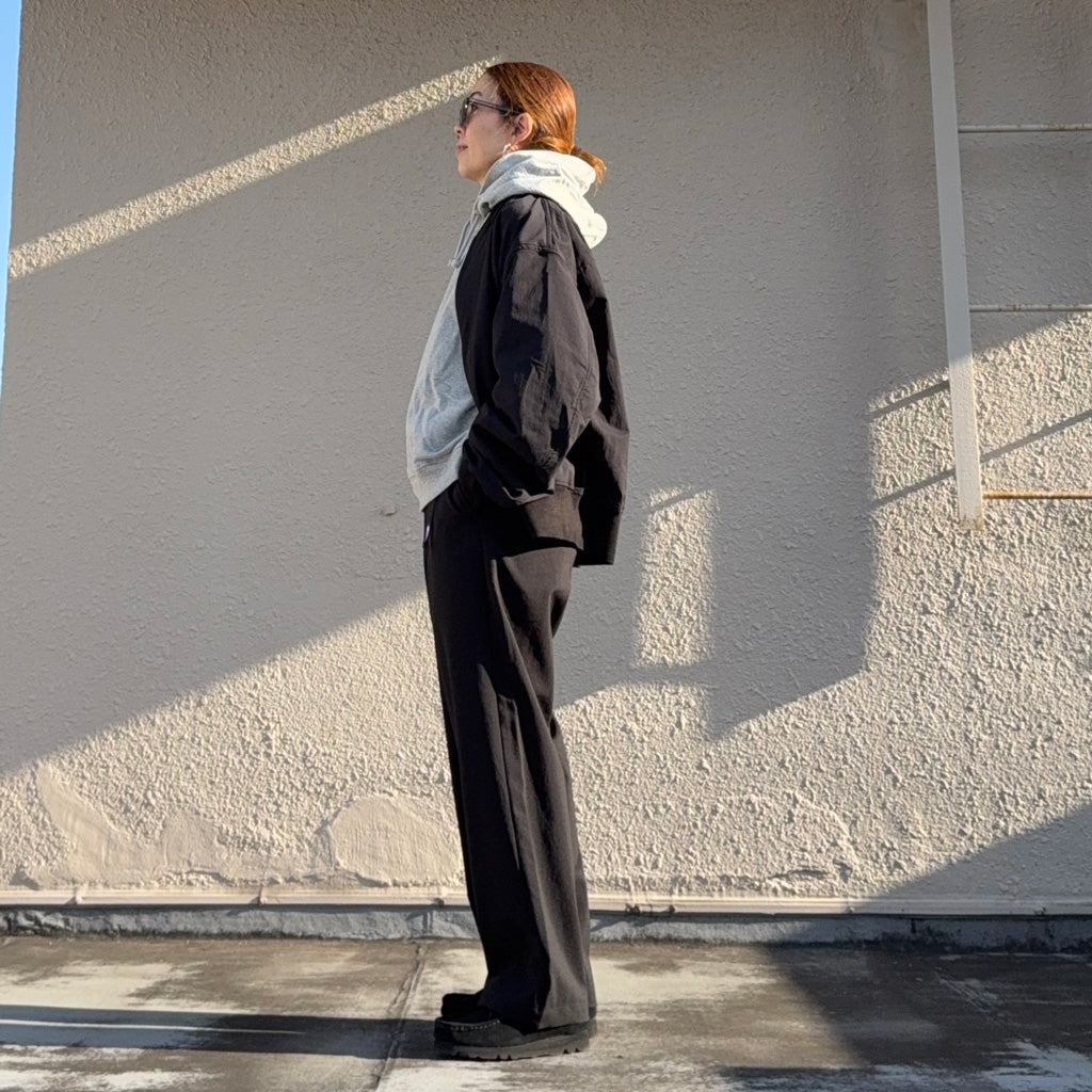 ポリエステルトロピカル生地を使用したフィールドワークパンツです。ストレッチ性、速乾性、撥水性を持ちあわせたユーティリティー素材で、強い撚りを加えたリサイクルポリエステル糸を使用した生地は、自然なシワ感とリネンライクな風合いを表現しています。股下には脚の可動域を大きくするマチ付きで、ウエストはウェービングベルト仕様。程よくゆとりのあるシルエットです。