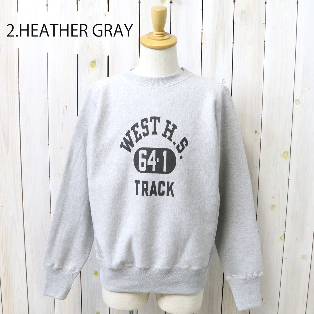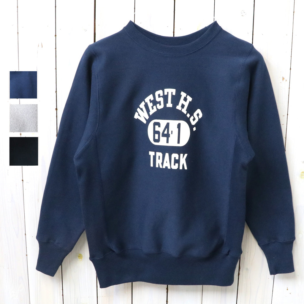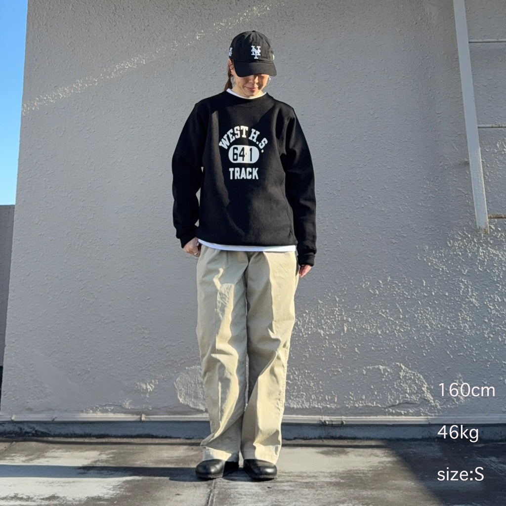 1960年代のリバーススタイルタイプを再現するために試行錯誤を繰り返したクルースウェットのプリントタイプです。縮みを軽減するために生地をヨコ使いした画期的なこのアスレチックスウェットは、徹底した度詰めで編まれ、硬いが弾性があり、重いがふわりとした柔らかさがあります。またウエアハウスでは「ヨコ筋」目を立たせるために、スウェットとしては珍しい「引きそろえ」の手法を採用したこだわりのスウェットです。フロントにWEST H.S.のプリントが施されています。
