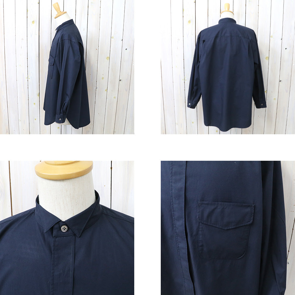 コットンブロードクロスを使用したウィングカラーシャツです。襟先のみ小さく折られた立ち襟が特徴的な形で、フロントは比翼仕立てでスッキリとしています。一般的にはドレッシーシャツですが、胸ポケットを配置して、EGらしいカジュアルな雰囲気に仕上がっており、普段使いしやすいデザインです。生地はややマットで自然な光沢のあるコットンブロードクロスを使用しています。
