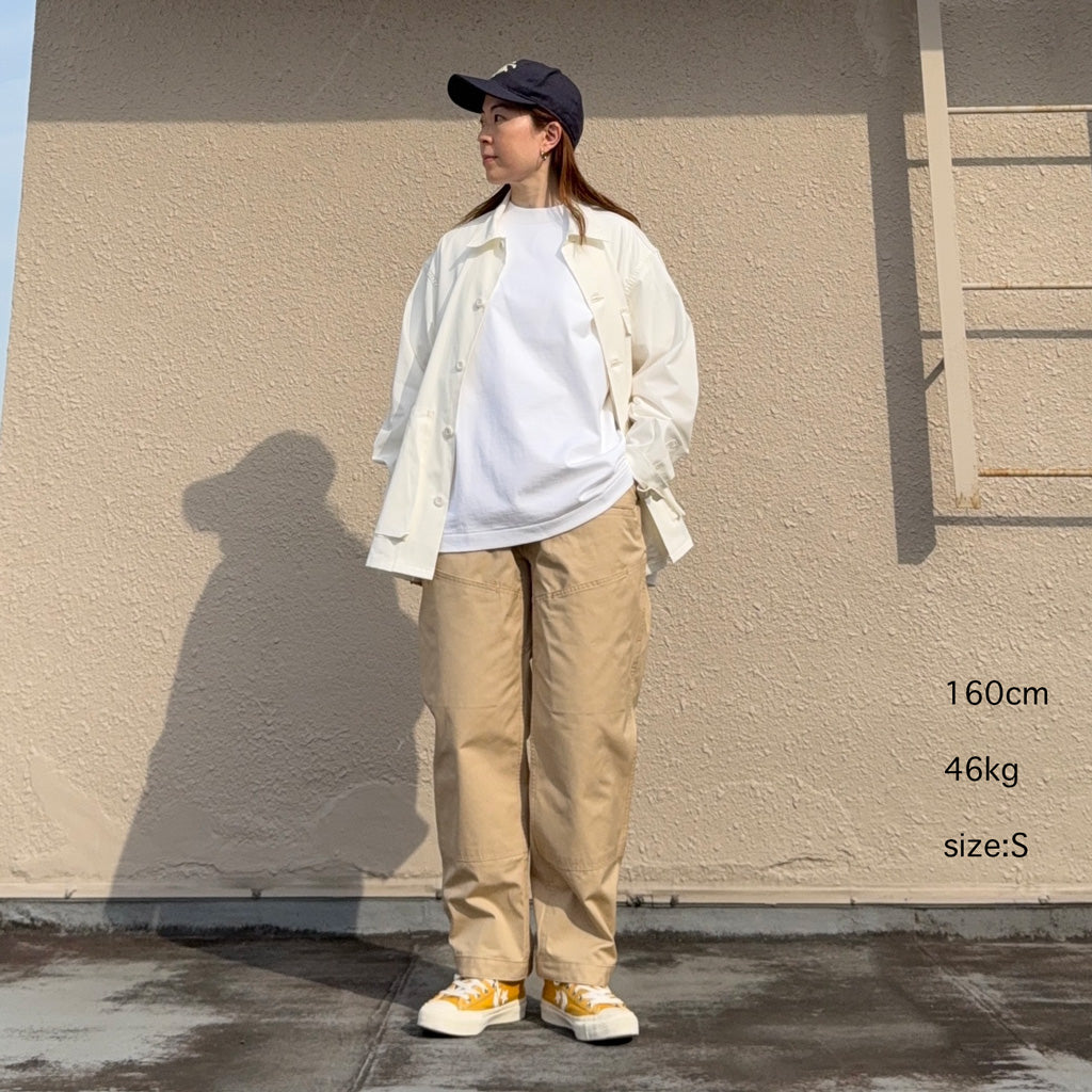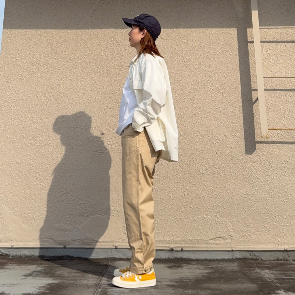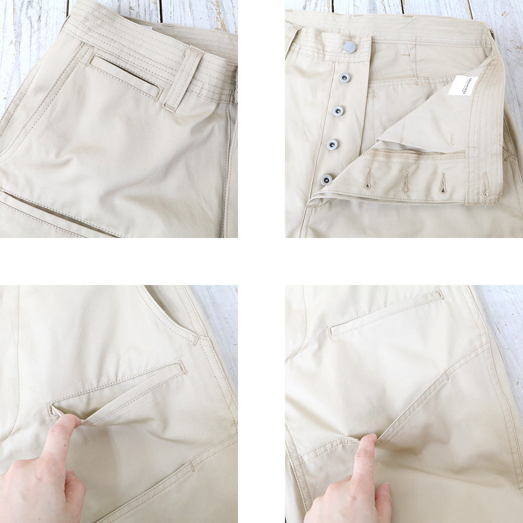 撥水性のあるウェザークロスを使用した新作9分丈パンツです。フロント側は左右のハンドポケットに加えて、両玉縁ポケットと太ももの当て布部分にもポケットがあり、バック側は左右で異なる丸みのある大きめのポケットとお尻の当て布が特徴的なデザインで、前後どちらとも存在感を放ちます。裾がボタンで調節できる作りです。程よい太さがバランスの良いシルエットで、9分丈の軽快な履き心地です。
