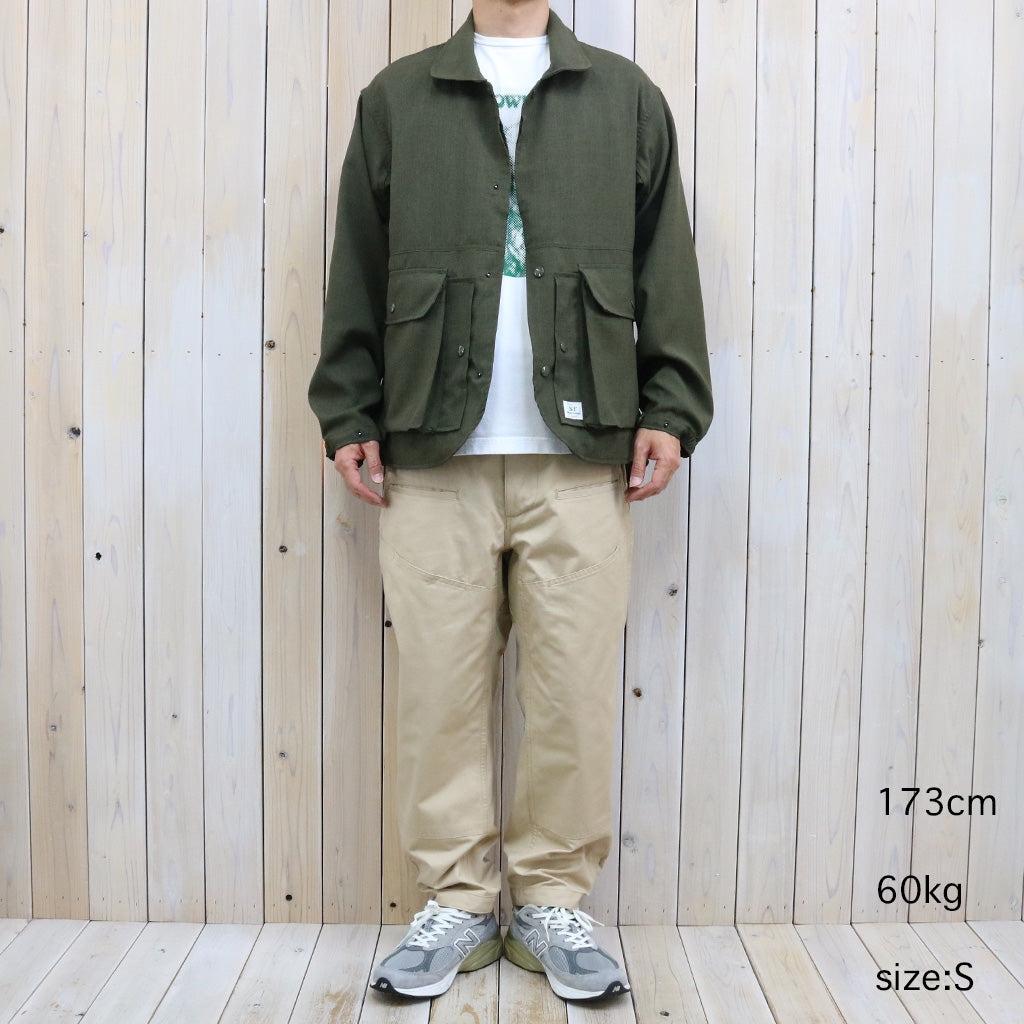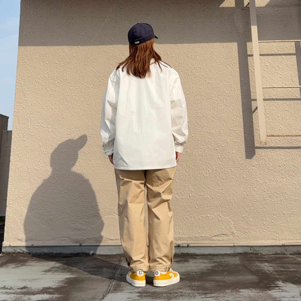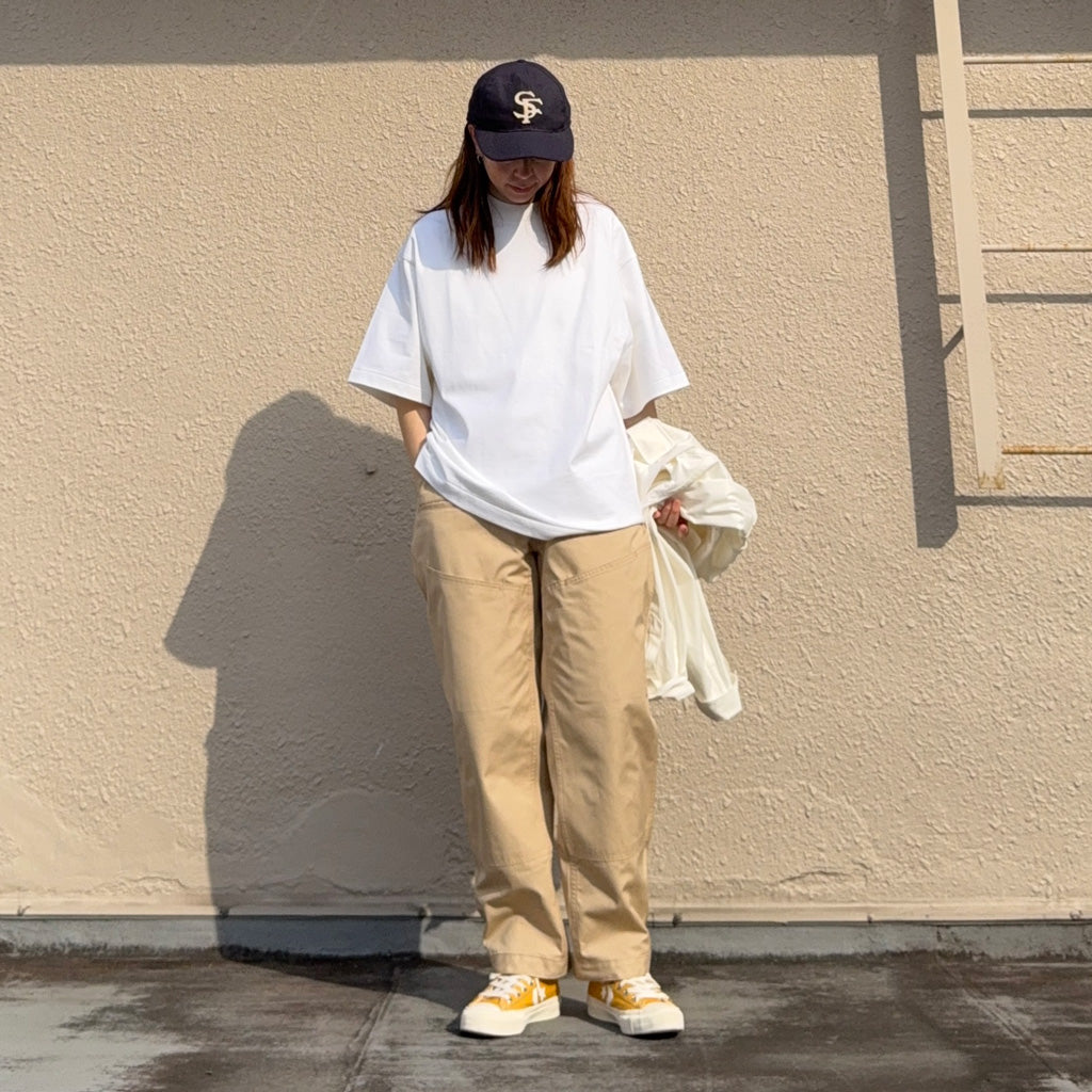撥水性のあるウェザークロスを使用した新作9分丈パンツです。フロント側は左右のハンドポケットに加えて、両玉縁ポケットと太ももの当て布部分にもポケットがあり、バック側は左右で異なる丸みのある大きめのポケットとお尻の当て布が特徴的なデザインで、前後どちらとも存在感を放ちます。裾がボタンで調節できる作りです。程よい太さがバランスの良いシルエットで、9分丈の軽快な履き心地です。