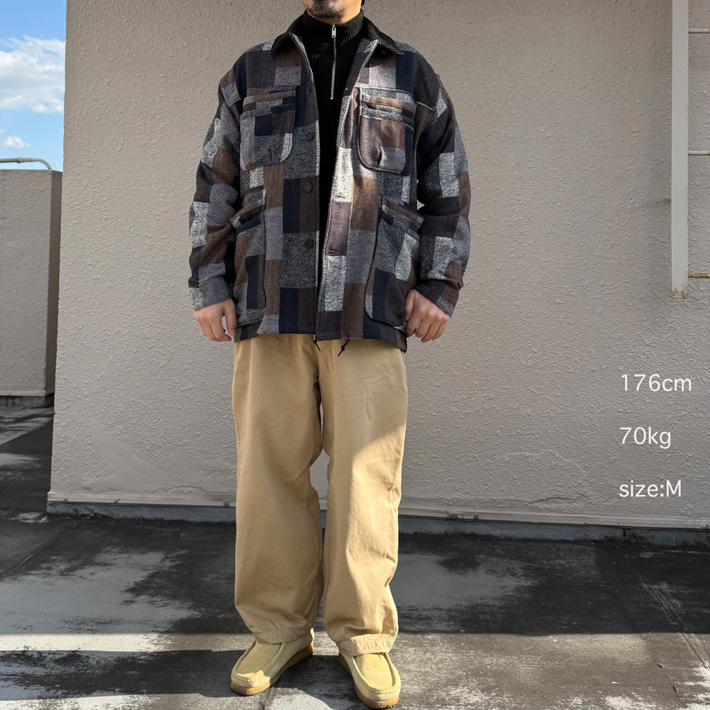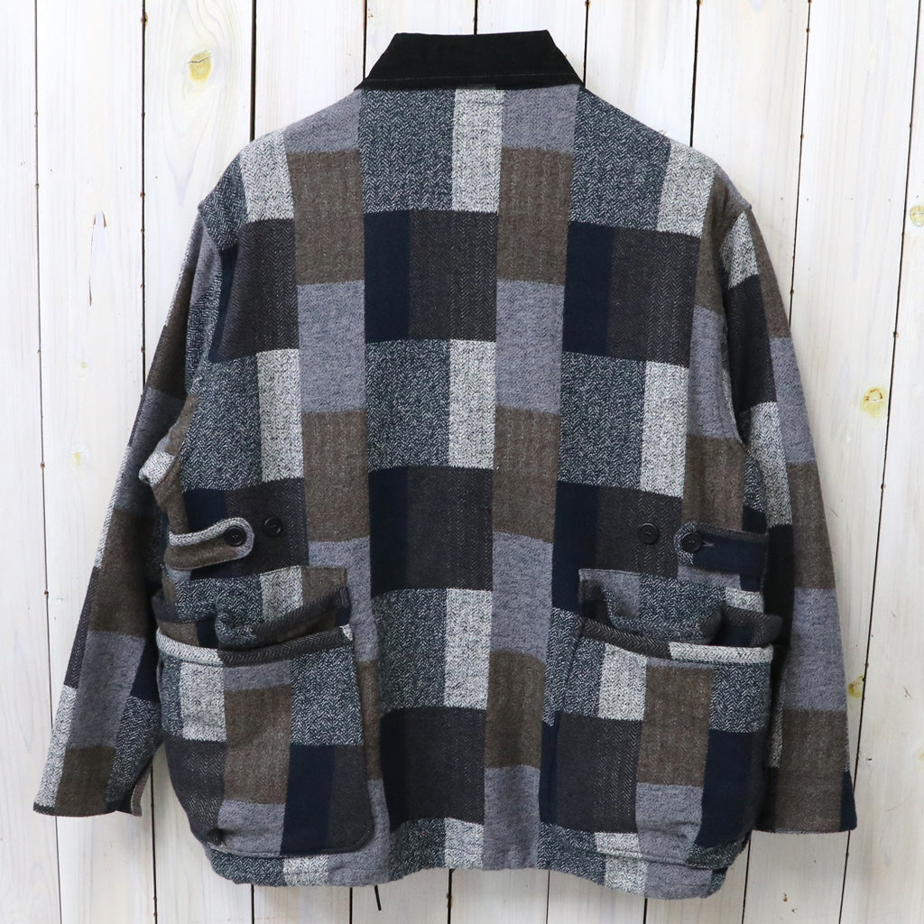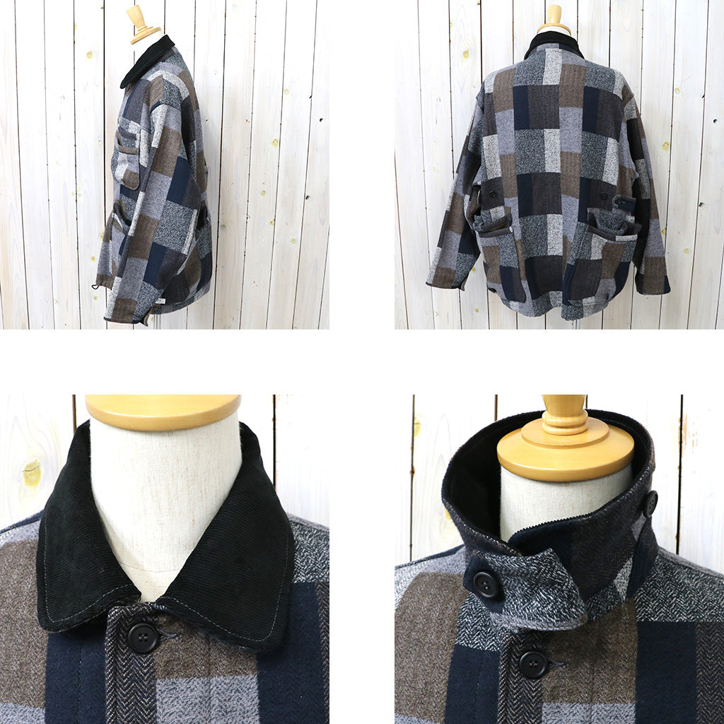 コットンツィードのパッチワークチェック柄に織られた生地を使用した新作ジャケットです。ファティーグジャケットをベースにし、着丈、身幅が少しゆったりとしたハーフコートのようなオーバーサイズのシルエットです。フロントにはWHOLE HOLEシリーズでお馴染みの2段ポケットが配置され、下の方はオーバーポケットになった容量の大きいポケットです。襟はコーデュロイの生地違いになっていてアクセントになり、スタンドカラーでも着用できます。パッチワーク柄が存在感のある一着です。