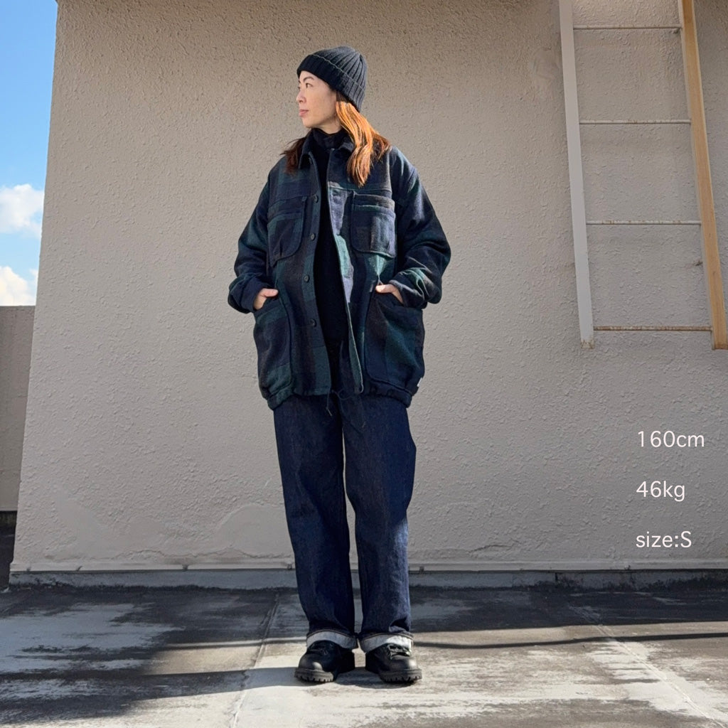 コットンツィードのパッチワークチェック柄に織られた生地を使用した新作ジャケットです。ファティーグジャケットをベースにし、着丈、身幅が少しゆったりとしたハーフコートのようなオーバーサイズのシルエットです。フロントにはWHOLE HOLEシリーズでお馴染みの2段ポケットが配置され、下の方はオーバーポケットになった容量の大きいポケットです。襟はコーデュロイの生地違いになっていてアクセントになり、スタンドカラーでも着用できます。パッチワーク柄が存在感のある一着です。