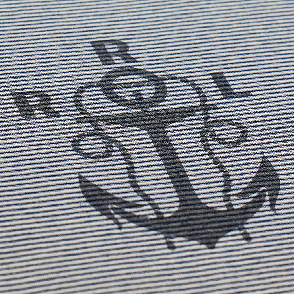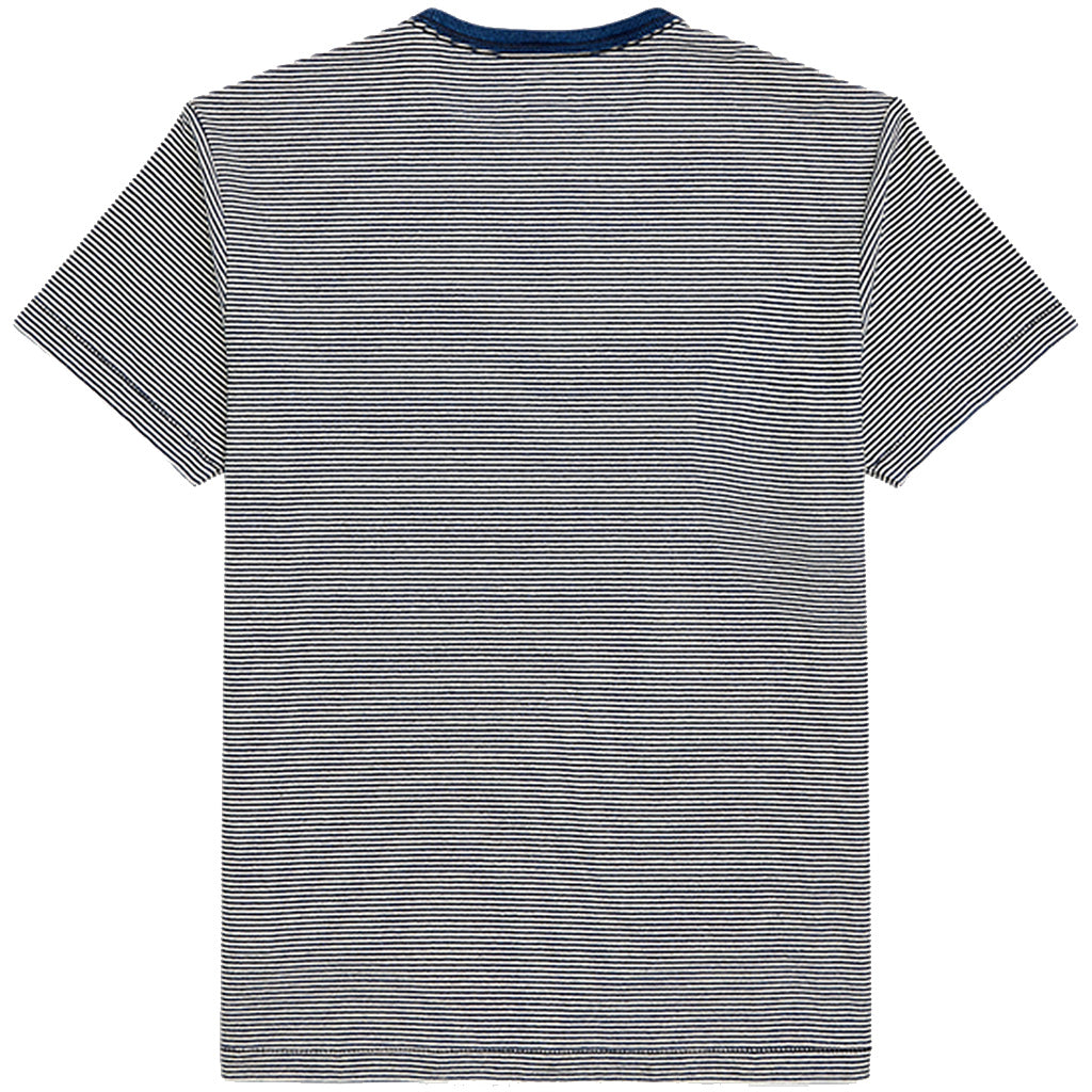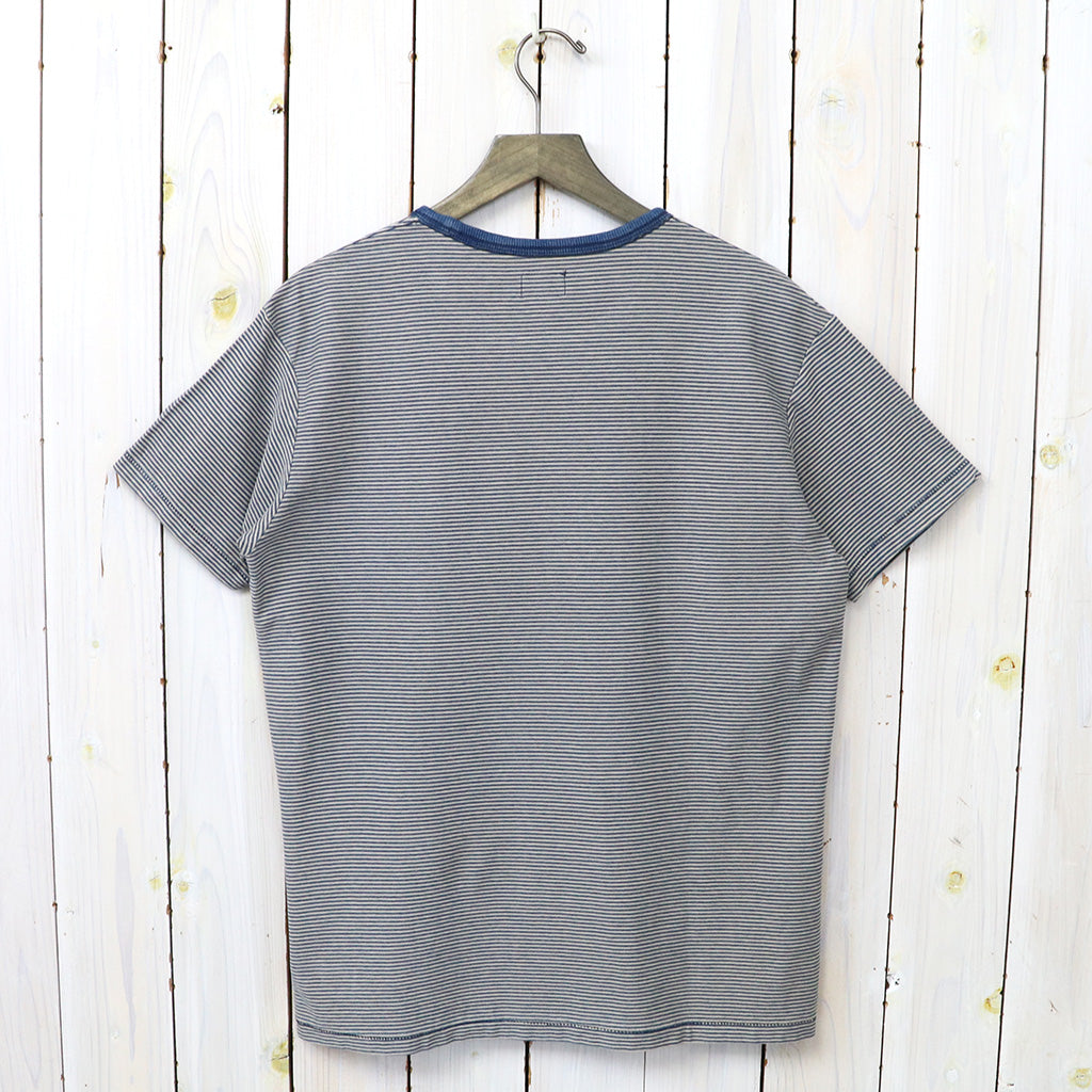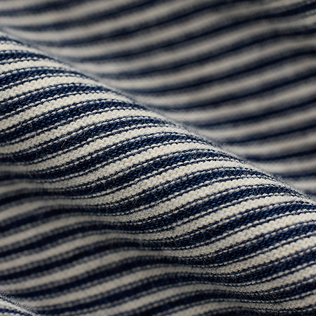 コットンジャージーを使用し、糸染めのマイクロストライプ パターンのプリントTシャツです。本藍染めが施され、ノーティカル風ロゴグラフィックのプリントされています。ウォッシュ加工で色褪せ感のあるルックを実現しています。