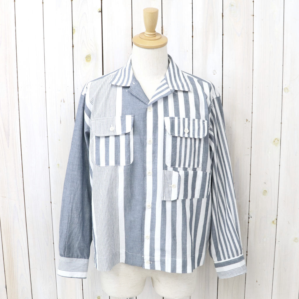 シャンブレー素材のマルチストライプ柄生地を使用したボーリングシャツです。ボールングをする時に着るシャツとして1950年代ごろにアメリカで普及したボーリングシャツをベースにし、襟は開襟、身幅がややゆったりめで、胸ポケットの下に付いた横向きデザインのポケットがアクセントになっています。ボックスシルエットなので、腰回りのゆったりしたパンツやショーツと相性の良く、軽めの羽織りとしても活用できる一枚です。