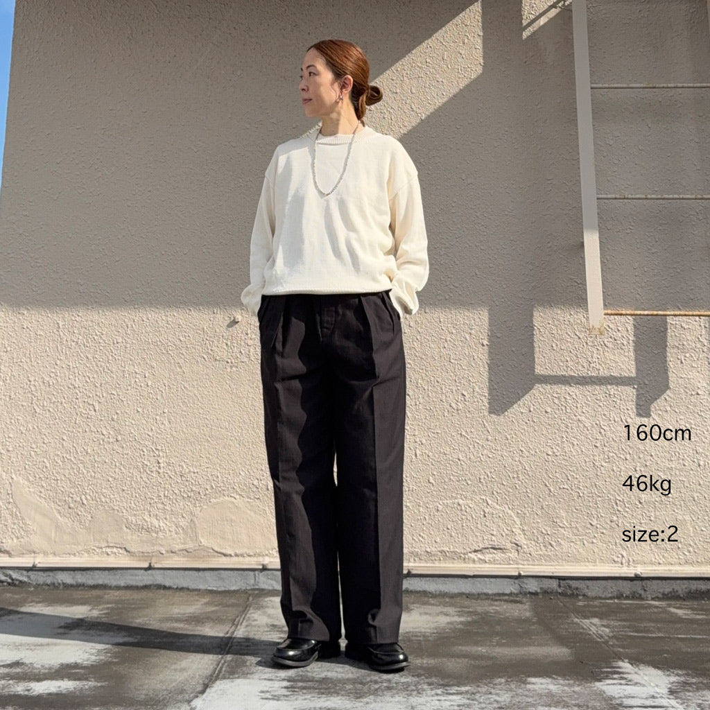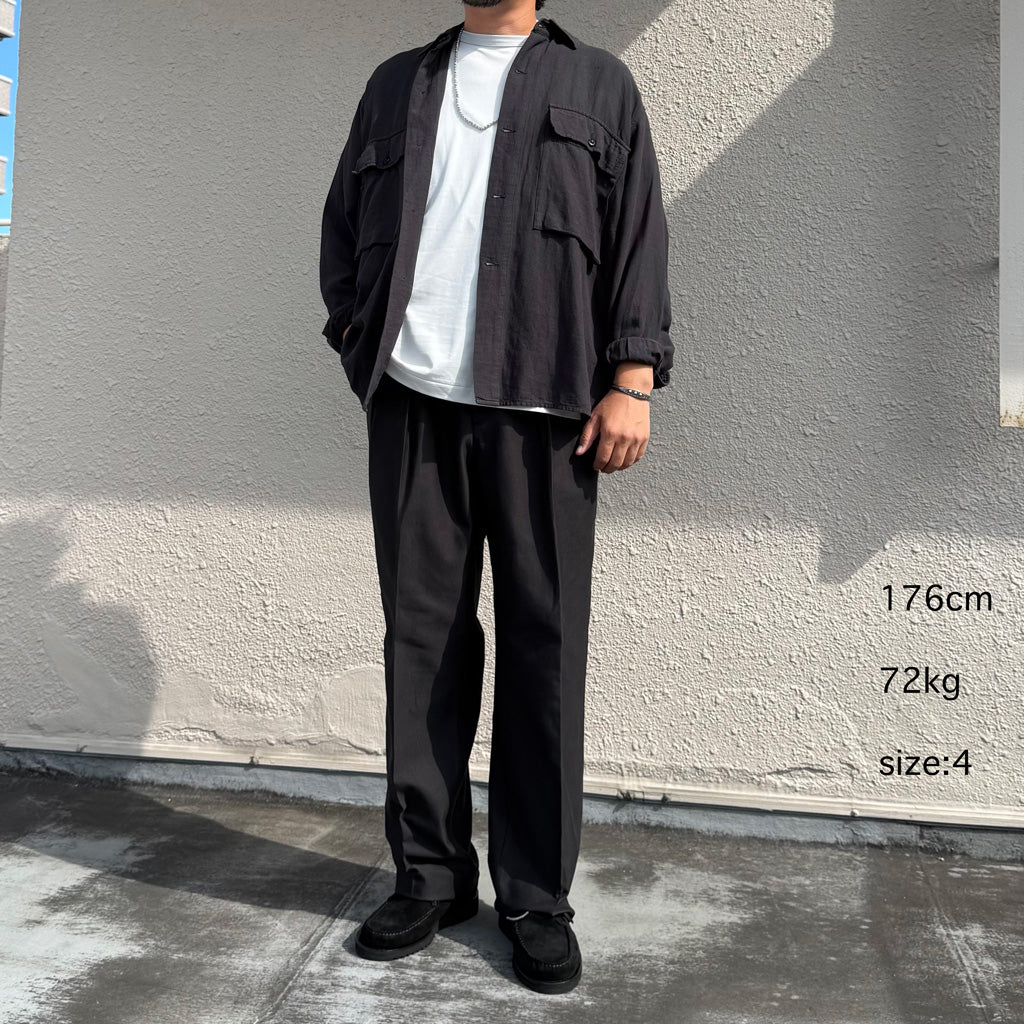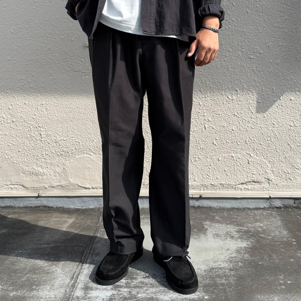 エジプト超長綿FINXを超高密度に織り上げたバギーサテン生地を使用したベルト付きタックパンツです。しっかりと洗い込む事でヴィンテージの様な淡めにカラーフェードした風合いに仕上げています。超長綿原料ならではの絶妙な光沢とヌメリ感がとても上質な生地で、リラックス感のある履き心地です。