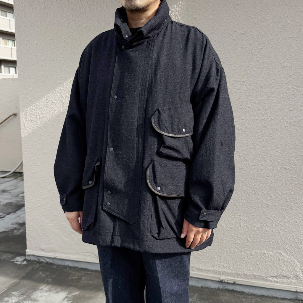 梳毛紡績した英国羊毛の最上品種ブルーフェイスを使用し、高密度に打ち込んだウール・サージを使用したハンタージャケットです。しっかりとしたハリ感と弾力性を持ち合わせ、味わい深いドレープがとてもエレガントな作りで、じっくり手洗いにて仕上げています。フロントに配置されたマチ付きの大きな3つのフラップポケットと長めのスタンドカラーが特徴的なデザインで、背中中央にプリーツが設けられています。ゆったりとしたフィット感の一着です。