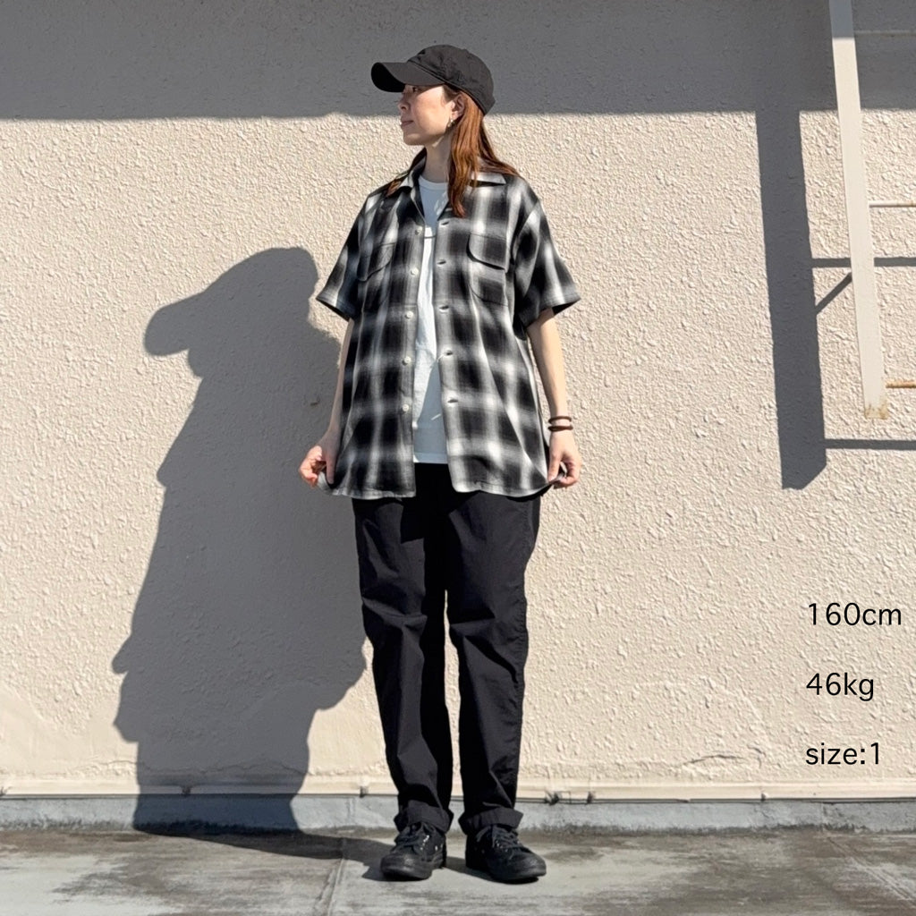 A short-sleeved shirt featuring an ombre check pattern beloved by rock musicians. The inspiration came from the flap-front style seen in vintage pieces from the 1950s. With a relaxed silhouette and the use of fluid material, we replicated the draped feel reminiscent of vintage styles from the 1950s.