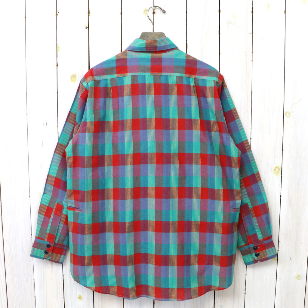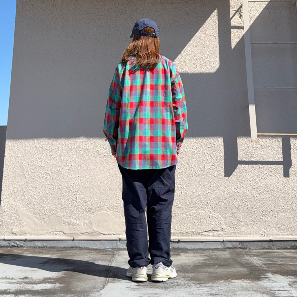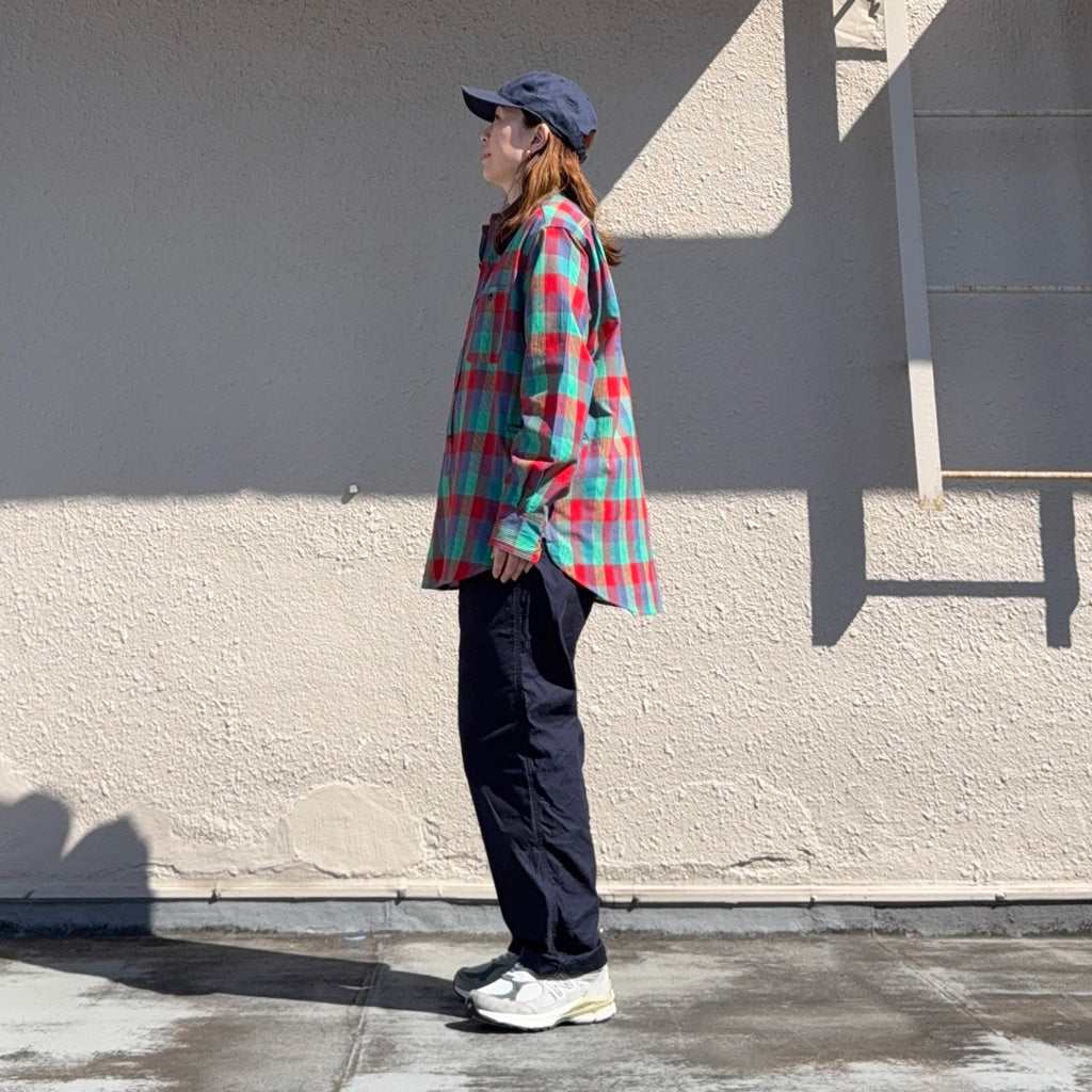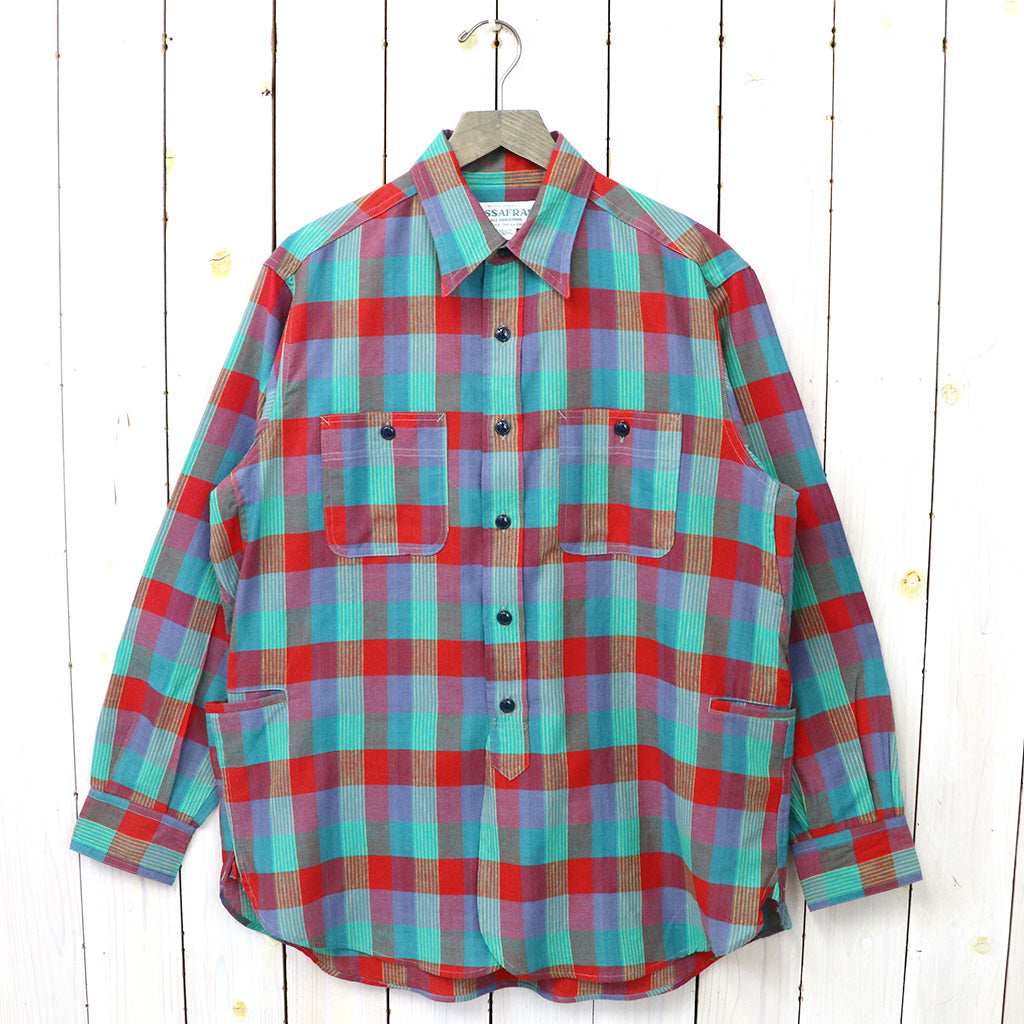 マドラスチェック柄生地を使用した定番シャツです。ワークシャツにSASSAFRASらしいポケットデザインがアレンジされた一枚で、フロントボタンは70~80年代のシャツの6つボタンを採用し、両胸のポケットの他に両サイドにもポケットが配置されています。脇下にはマチがあり腕が動かしやすい作りで、裾のガゼット部がリフレクターになっています。着丈が少し長めなクラシカルな雰囲気のワークシャツです。