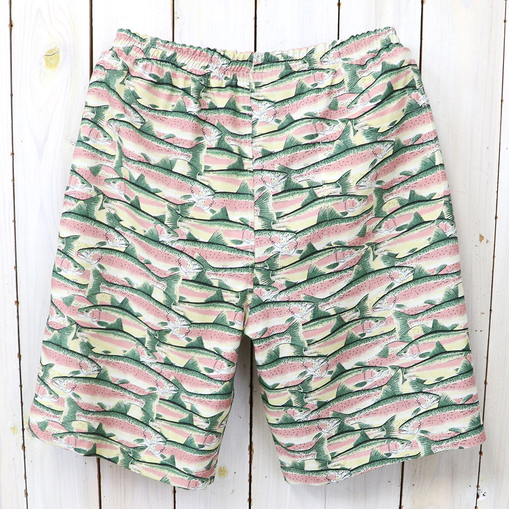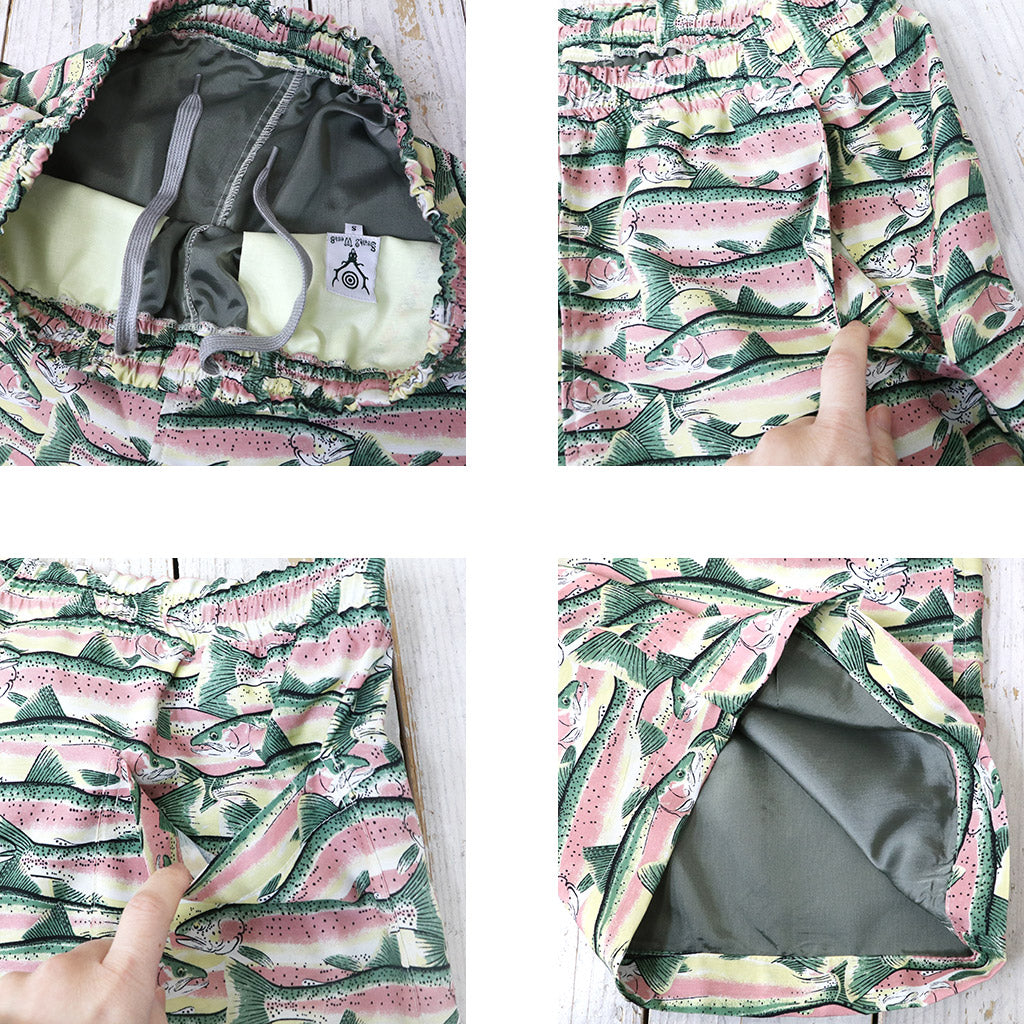 リラックス感のあるシルエットが特徴のイージーショーツです。今シーズンからスタートした、北海道に生息する動植物を描いたシリーズ ”’Ole Ua.’Ole Anuenue”のショーツで、滑らかなレーヨン生地に全面にトラウト柄がプリント存在感のあるデザインです。全面に裏地が付いていて、履き心地も良いです。