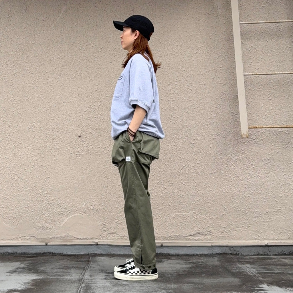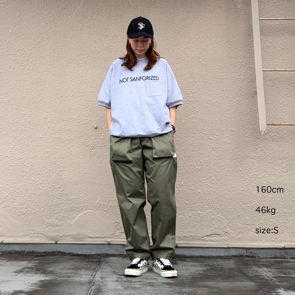 薄手のスウェット生地を使用したショートスリーブスウェットです。右胸にはポケットがあり、フロントプリントはポケットに重なるように入っています。身幅の少しゆったりとしたシルエットです。