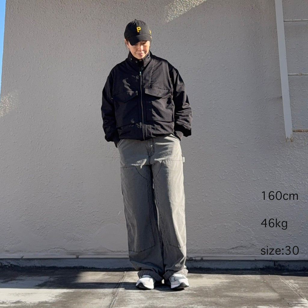 タテ糸にインディゴ染めしたコットン、ヨコ糸にリサイクルナイロンを使用したインディゴウェザークロスを使用したワイドストレートのデッキパンツです。ウエストはエラスティックシャーリング、ドローコード仕様で、フロントファスナー開き。股下には脚の可動域を広げるマチ付きです。