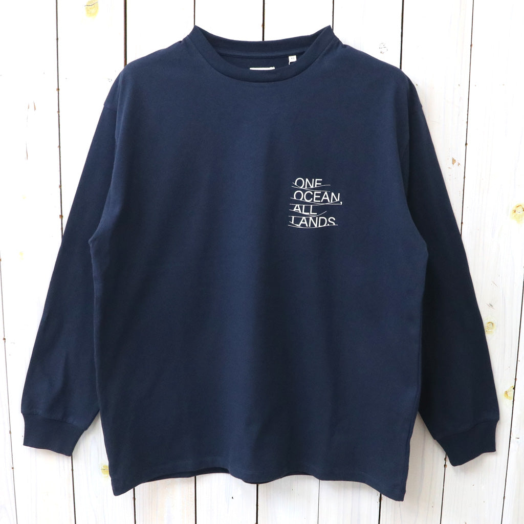 オーガニックコットン天竺を使用したプリントロングスリーブTシャツです。左胸にONE OCEAN, ALL LANDSのプリントされたシンプルなデザインで、リラックス感のあるゆったりとしたシルエットです。
