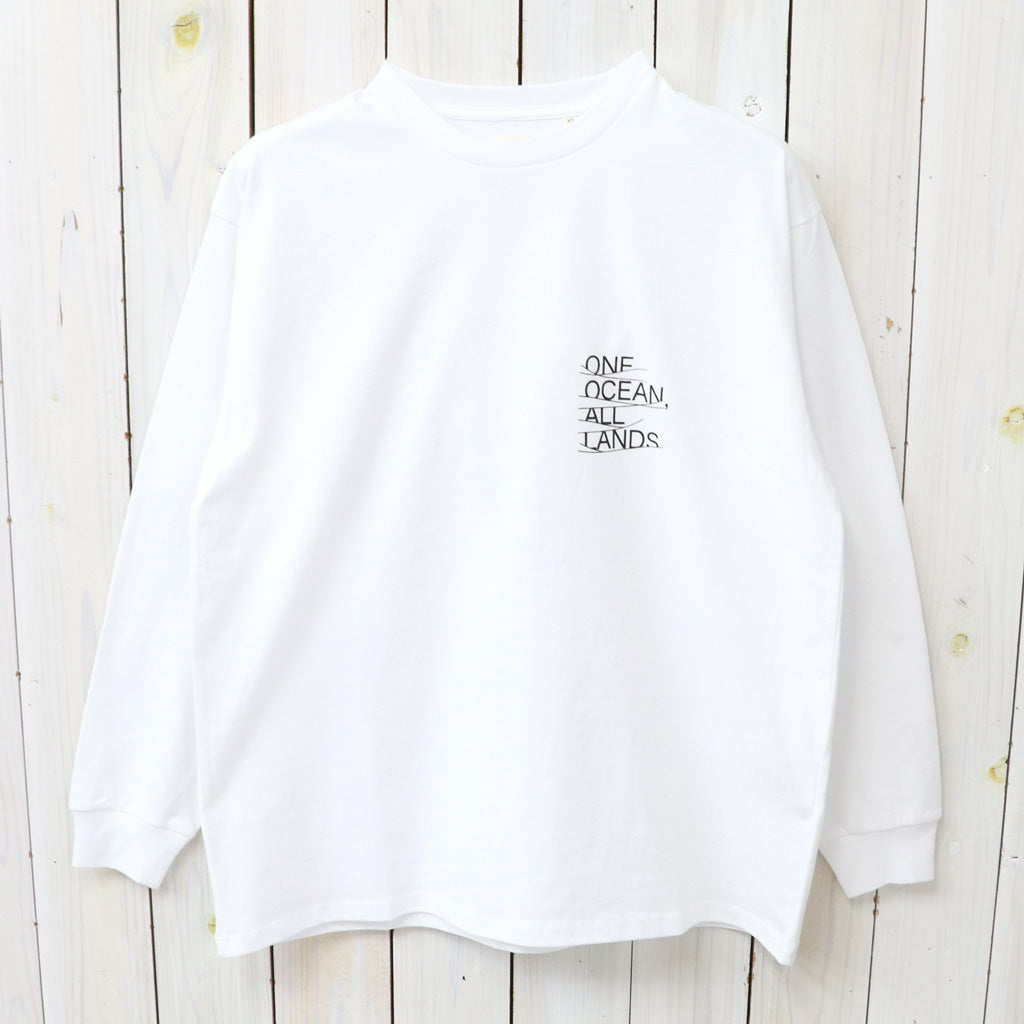 オーガニックコットン天竺を使用したプリントロングスリーブTシャツです。左胸にONE OCEAN, ALL LANDSのプリントされたシンプルなデザインで、リラックス感のあるゆったりとしたシルエットです。