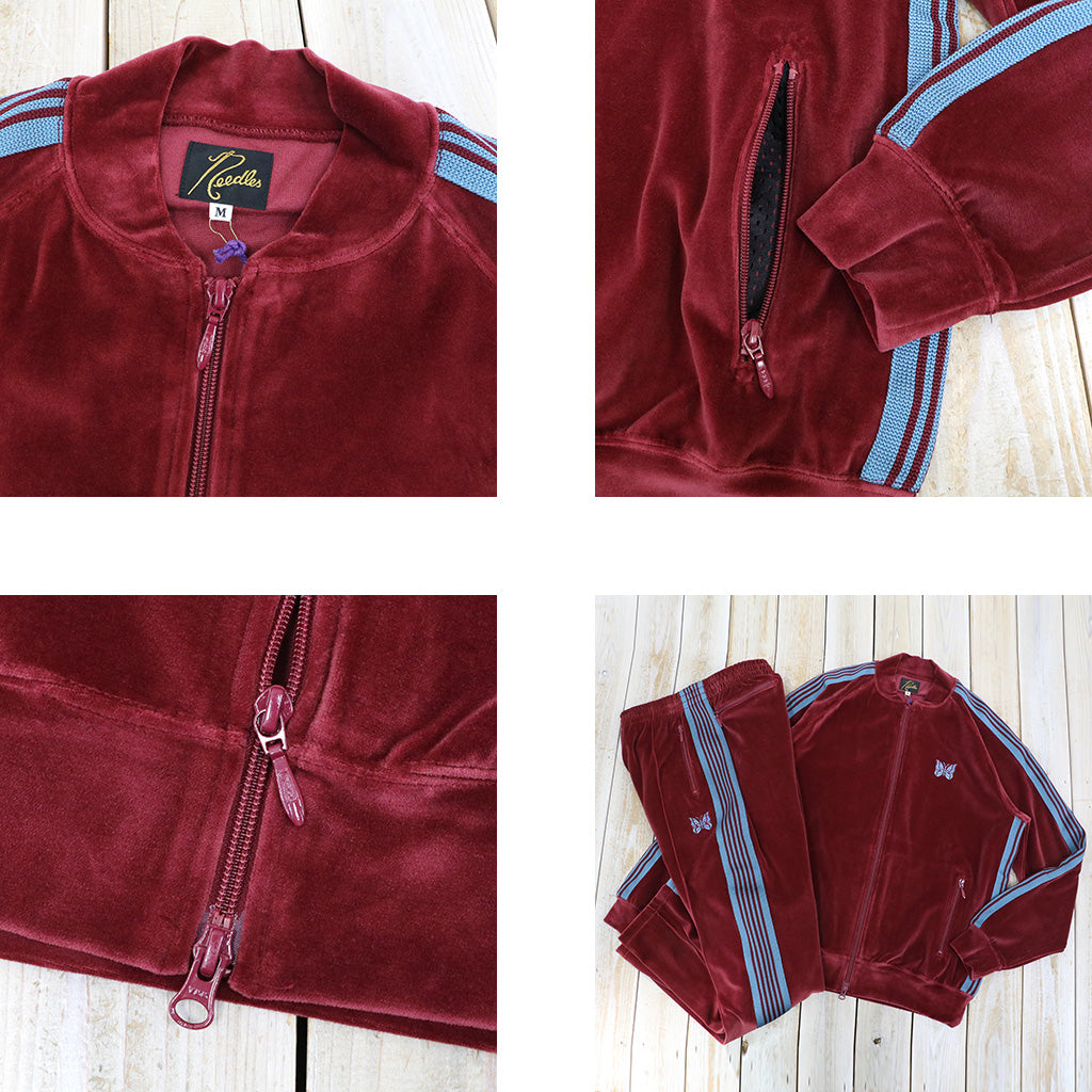 Needlesの代表的なアイテムのトラックジャケットです。程良い光沢感のあるベロア素材を使用し、衿はクラシカルなショートリブで、フロントジップはダブルジップ仕様、左胸にNeedlesアイコンでもある蝶の刺繍が施されています。滑らかでしっとりとしたソフトな着心地で、スポーティーなアイテムをテーラードスタイルやミリタリースタイルなどとミックスさせて個性的なスタイリングを楽しめます。同素材のパンツとセットアップ着用が可能です。