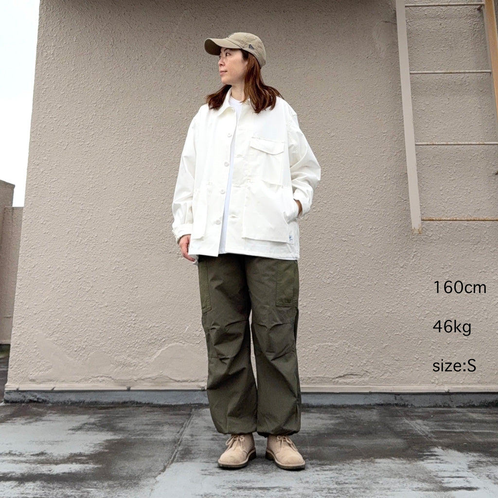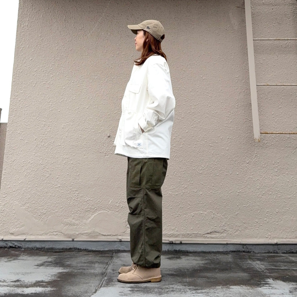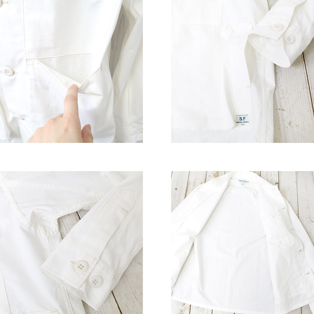 SASSAFRAS定番のシャツにもアウターにもなるハーフシリーズのシャツジャケットです。今期はオフホワイトのアーミーリップストップ生地を使用し、ミリタリーテイストながら爽やかな印象です。フロントのポケットはマチありの大きい作りで、上からと横からの両方から手入れが可能です。左胸にはフラップポケットがあり、脇下と裾にはガゼットがついており、動きやすい作りになっています。ゆったりとした着心地で、よりジャケットに近いシルエットの一着です。