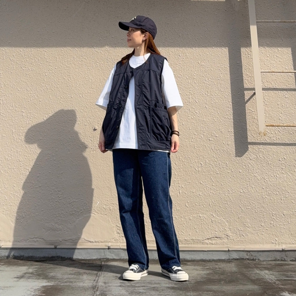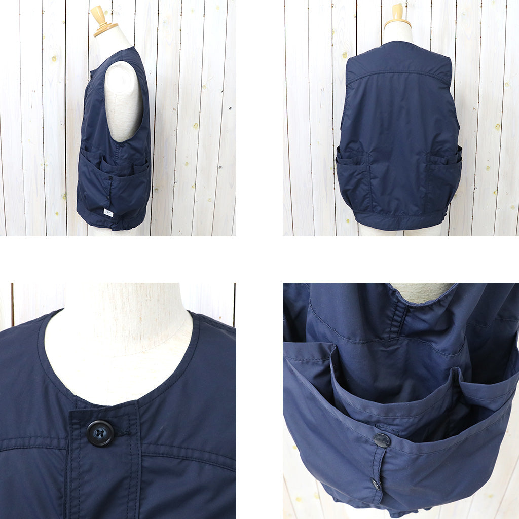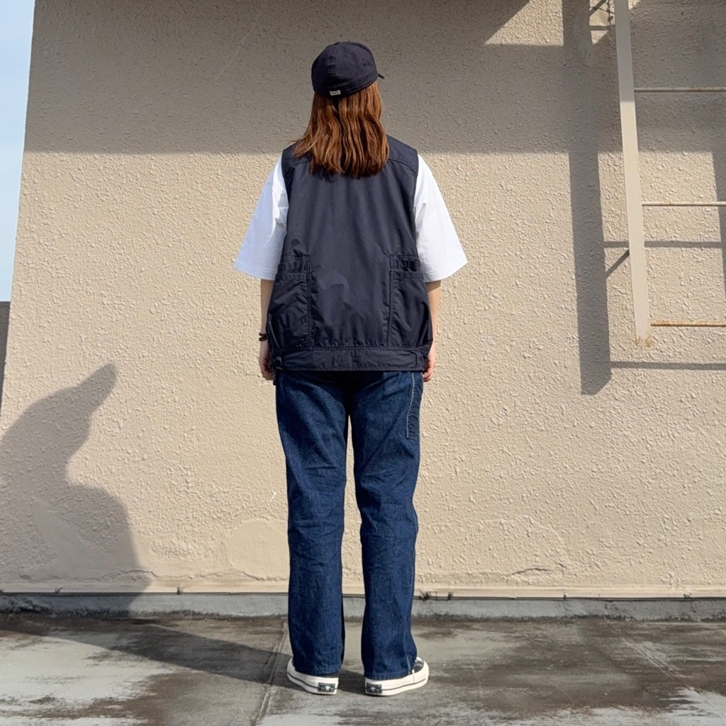ナイロン生地を使用した定番ベストです。襟なしで、少し身幅がゆったりとしたシルエットです。両サイドにはWHOLE HOLEシリーズでお馴染みの2段のオーバーポケットが配置され、存在感のあるベストで、春夏のレイヤードスタイルにおすすめの一着です。