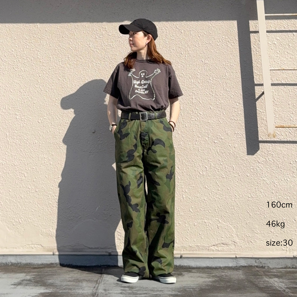 朝鮮戦争後に採用されたアメリカ海兵隊(USMC)P53 HBT ユーティリティパンツです。海兵隊特有の丸いヒップポケットが特徴で、非常に珍しいカモフラージュパターンがヘリンボーン生地の上からプリントされ、多色が使用されているため色と色の重なりが独特の雰囲気があります。