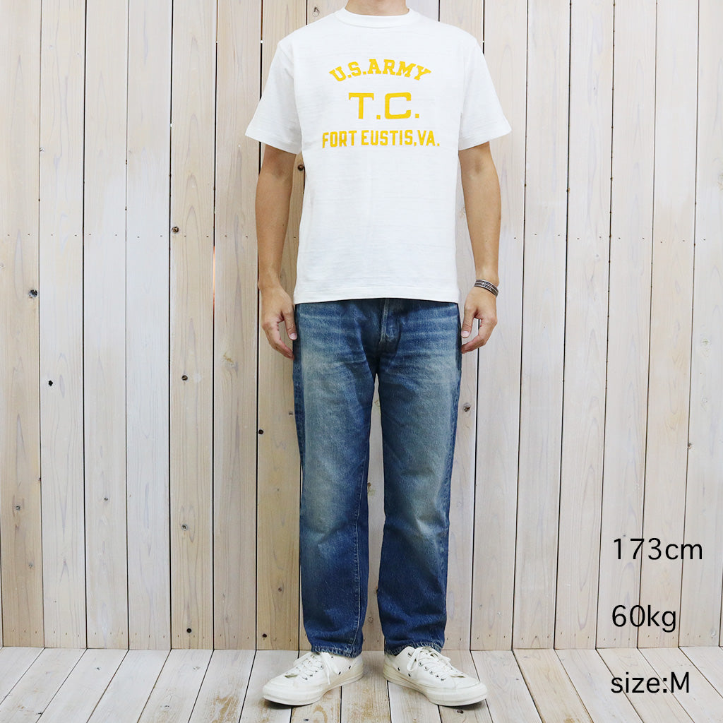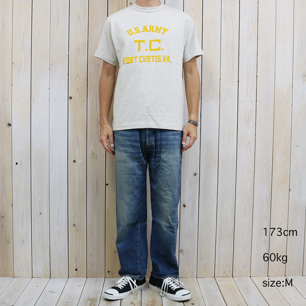 「吊り編み機より希少」といわれる旧式のローゲージ編み機で編まれたウエアハウスの定番Lot 4601のプリントTシャツです。12番のムラ糸で独特の陰影が出るように編まれたこの生地はシャドウボーダーと呼ばれており、無地でありながらうっすらと横段のようなムラが浮かびます。極端に前下がりの現代的なネックラインではなく、フライスにパイピングを噛ませる事で強度を保ちながら、着込むほどにネックラインが緩み自然な前下がりが生じてきます。フロントにフロッキープリントが施されています。