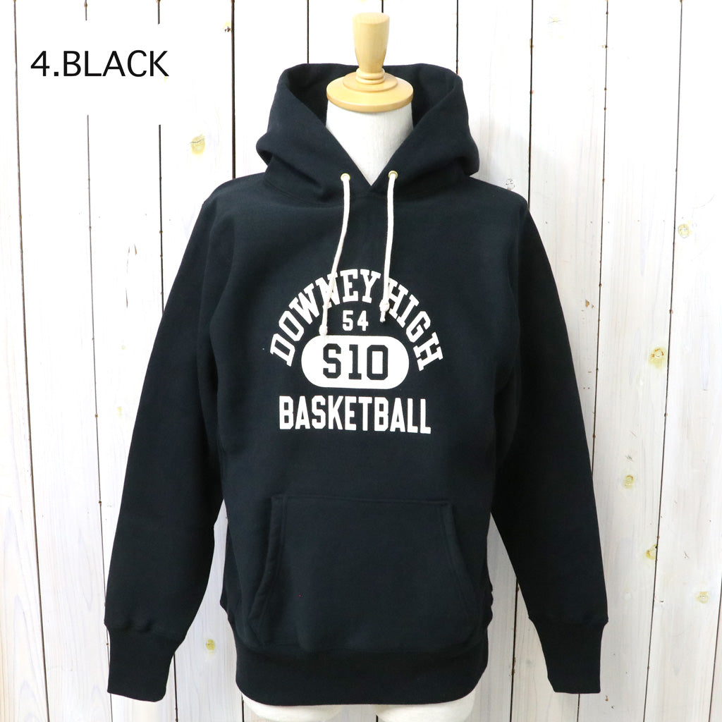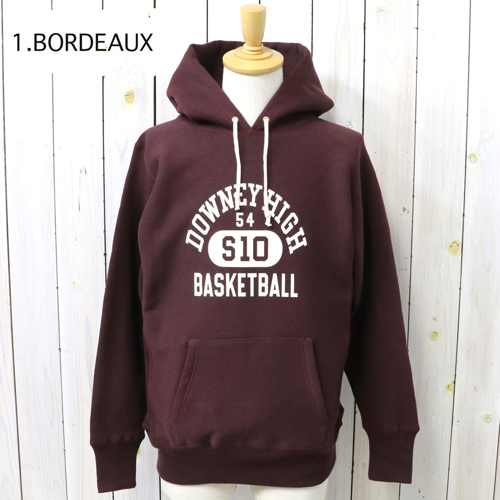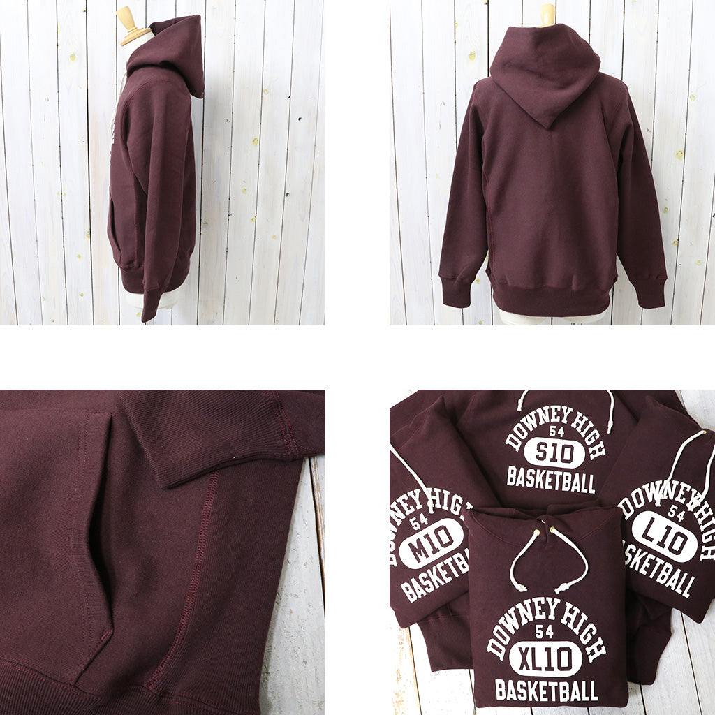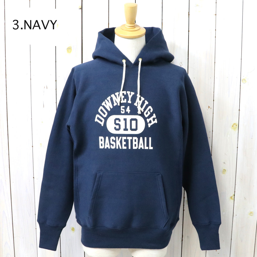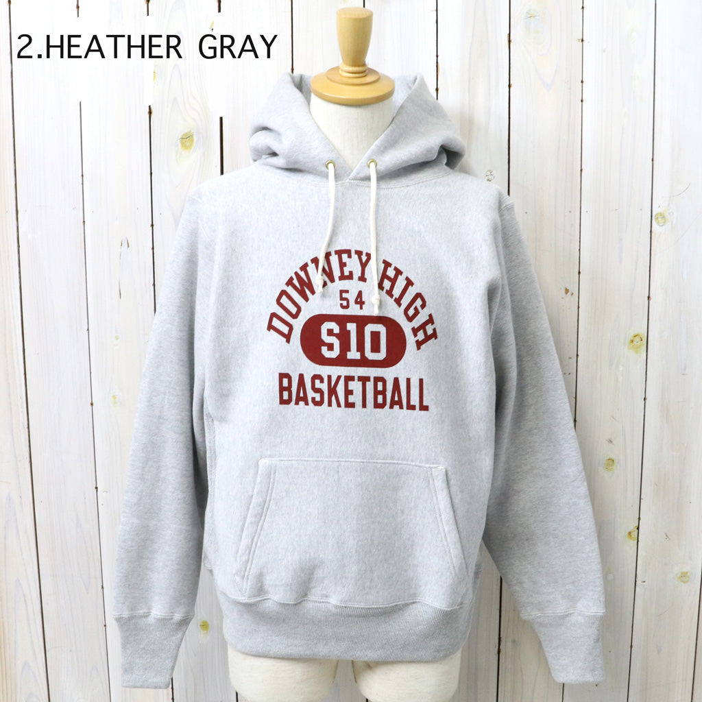 希少な1930年代の杢のスウェットを再現するために試行錯誤を繰り返した、リバーススタイル仕様のプルオーバーパーカです。生地をウールを編むような作り方で作っていた時代の稀少なスウェットは、鹿の子を吊り編みで機で製造したあと、裏起毛をかけ、さらには反染めと呼ばれる、生地の段階で染めるのではなく糸を染めてから生地を編むため、表面に独特のちらつきが見え、独特のムラ感が魅力になります。フロントにDOWNEY HIGH BASKETBALLのプリントが入ったデザインで、中央の”10”の横にボディーサイズがそれぞれプリントされています。