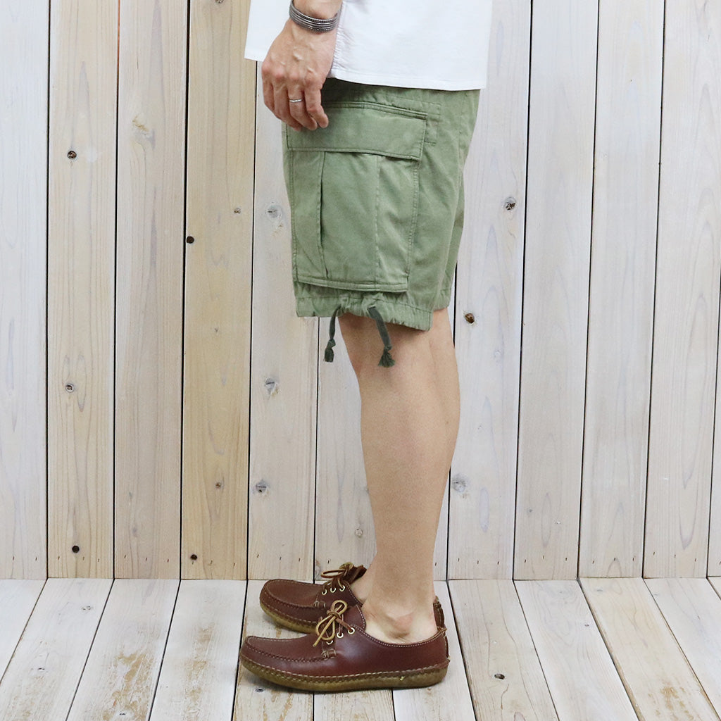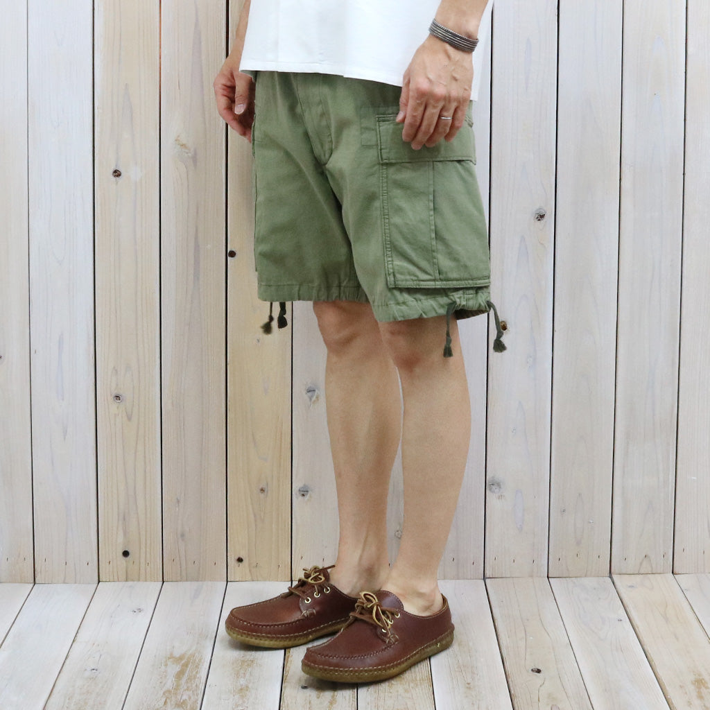 コットンリップストップ生地を使用したカーゴショーツです。ウエストはサイドのアジャスターで微調節も可能です。フロントはジップフライで、左右にフラップポケット、両サイドにカーゴポケット、バックにもフラップポケットが左右に配置されています。裾は絞ることができ、ウォッシュ加工が施された、履き込んだようなヴィンテージの雰囲気を演出しています。