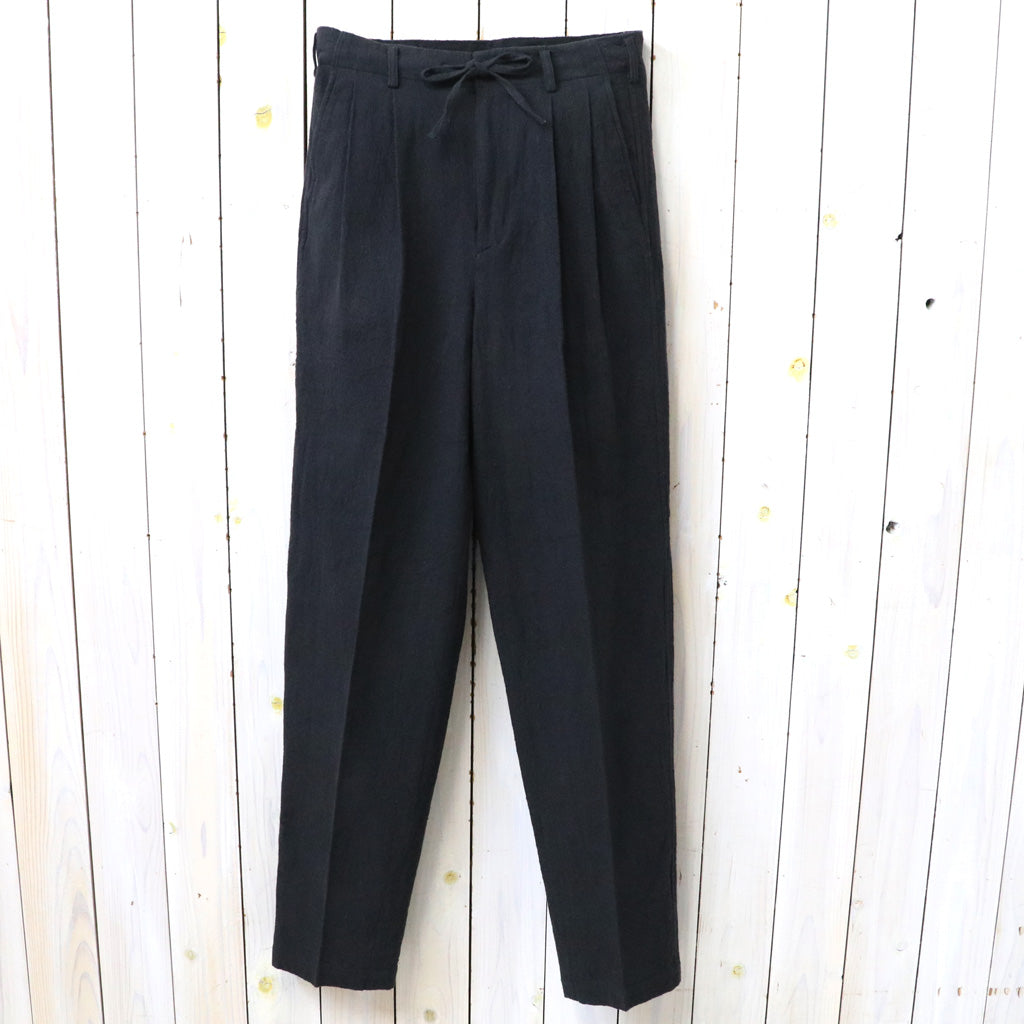 スラブコットン生地を使用した新作トラウザーズです。2タック入った、センタープレスの綺麗なシルエットですが、ウエストはドローコードが付いているイージーパンツ仕様が特徴です。ベルトループも付いているので、ベルトを装着することも可能です。生地表面に独特の凹凸感のあるスラブ素材で、履き心地は軽く、同素材のジャケットとセットアップ着用が可能です。