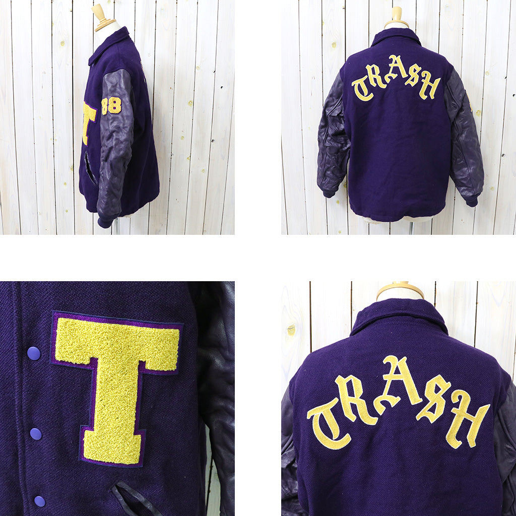 ウールメルトン生地を使用したアワードコートです。ボディーにメルトン、袖にカウハイドを組み合わせ、前後に刺繍の施されたレターマンジャケットをベースに、今シーズンのテーマのTRASHをモチーフにデザインされた一着です。