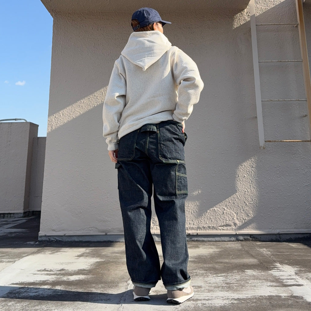定番の13.5ozデニム生地を使用したFALL LEAFシリーズパンツです。定番のFALL LEAF PANTSにさらにポケットがプラスされ、オーバーオールのようなワークポケットやループなどが追加されています。腰回りから太ももにかけてはややゆったりとし、裾に向かって少しテーパードしたボリューム感のあるシルエットです。ワークテイストがお好きな方にオススメの一本です。