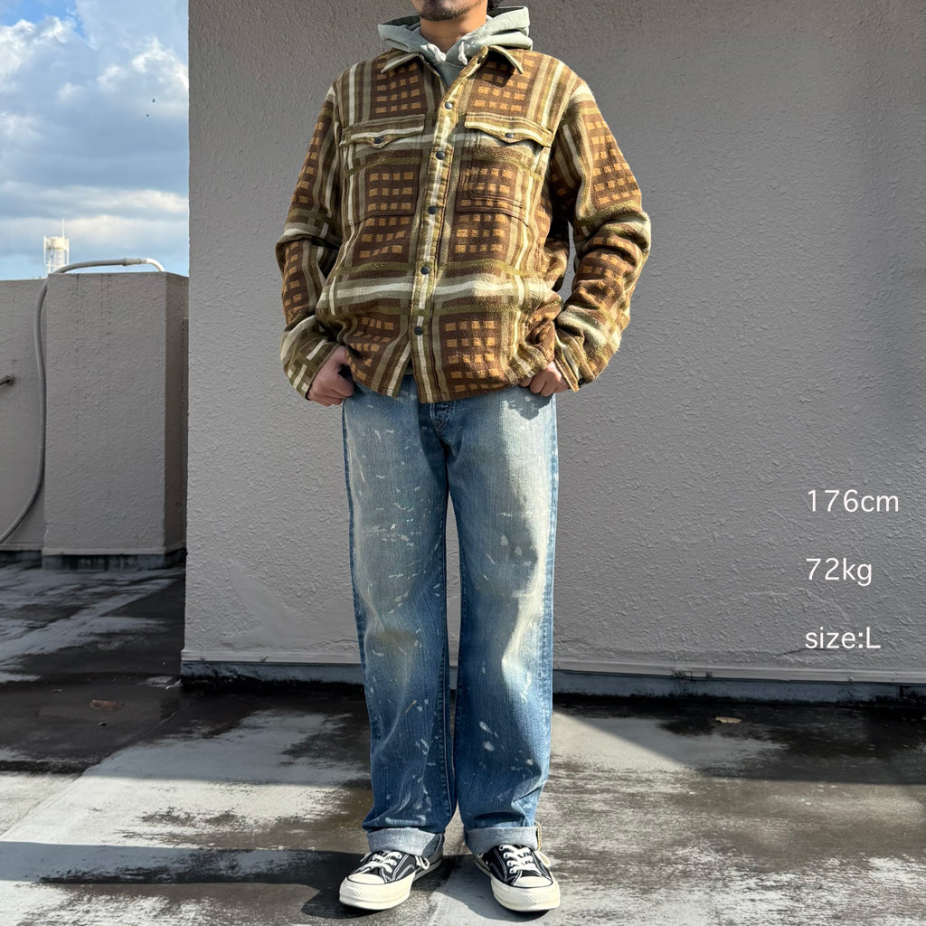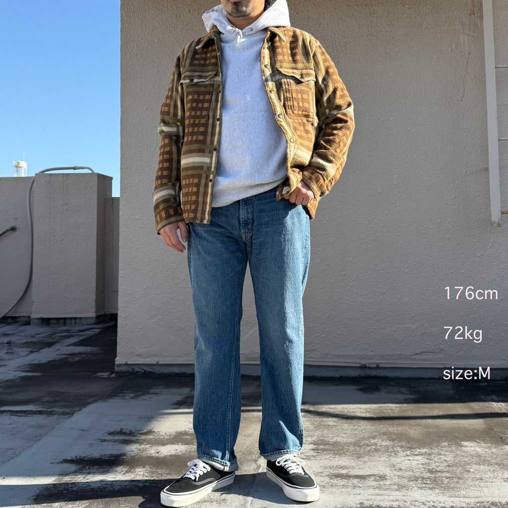 繊維染めとブラッシュ加工の仕上げを施したジャカード織りのコットン生地を使用したシャツジャケットです。内側はツイルで補強され、フロントはヴィンテージ風のカスタムスナップを使用しています。