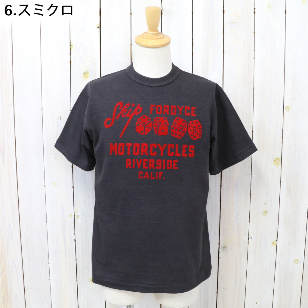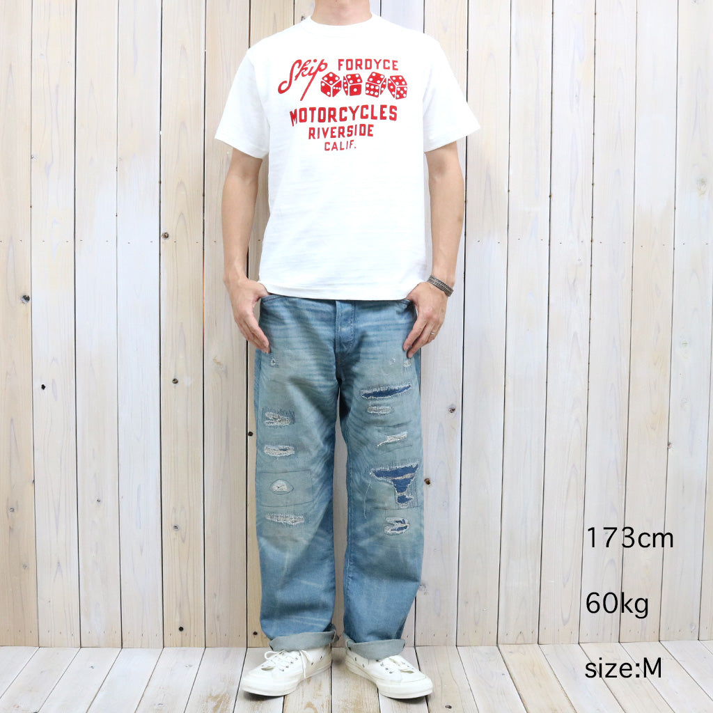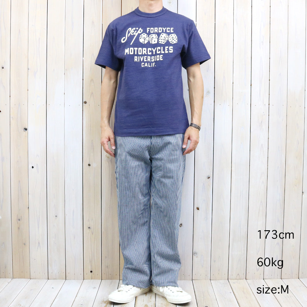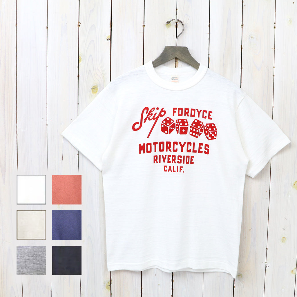「吊り編み機より希少」といわれる旧式のローゲージ編み機で編まれたウエアハウスの定番Lot 4601のプリントTシャツです。12番のムラ糸で独特の陰影が出るように編まれたこの生地はシャドウボーダーと呼ばれており、無地でありながらうっすらと横段のようなムラが浮かびます。極端に前下がりの現代的なネックラインではなく、フライスにパイピングを噛ませる事で強度を保ちながら、着込むほどにネックラインが緩み自然な前下がりが生じてきます。フロントにフロッキープリントが施されています。