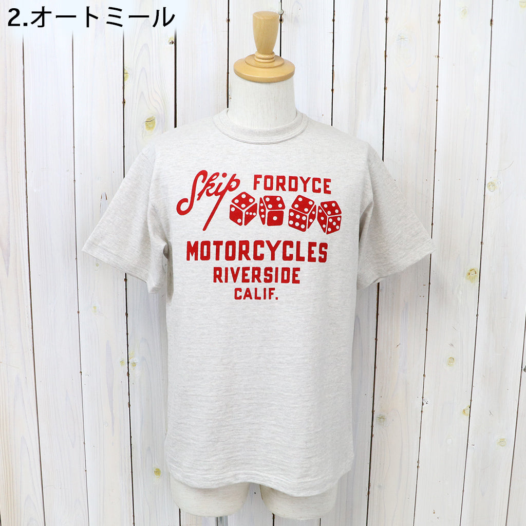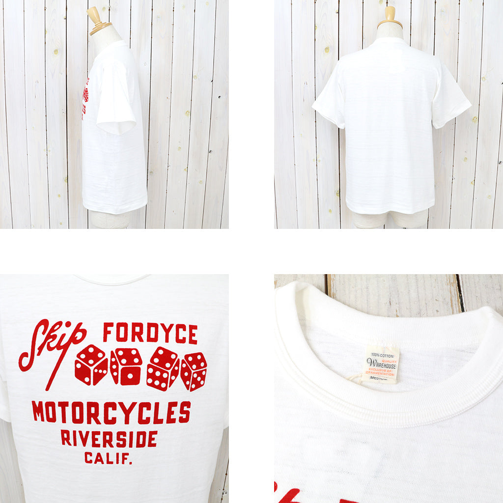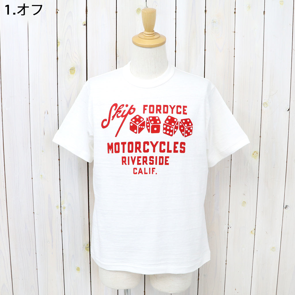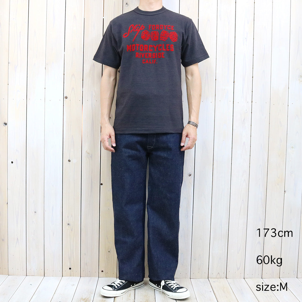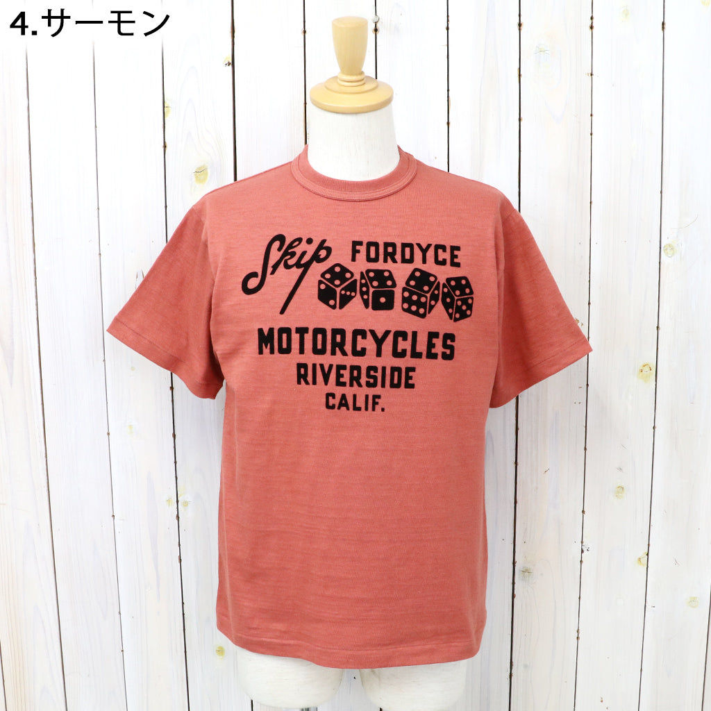 「吊り編み機より希少」といわれる旧式のローゲージ編み機で編まれたウエアハウスの定番Lot 4601のプリントTシャツです。12番のムラ糸で独特の陰影が出るように編まれたこの生地はシャドウボーダーと呼ばれており、無地でありながらうっすらと横段のようなムラが浮かびます。極端に前下がりの現代的なネックラインではなく、フライスにパイピングを噛ませる事で強度を保ちながら、着込むほどにネックラインが緩み自然な前下がりが生じてきます。フロントにフロッキープリントが施されています。
