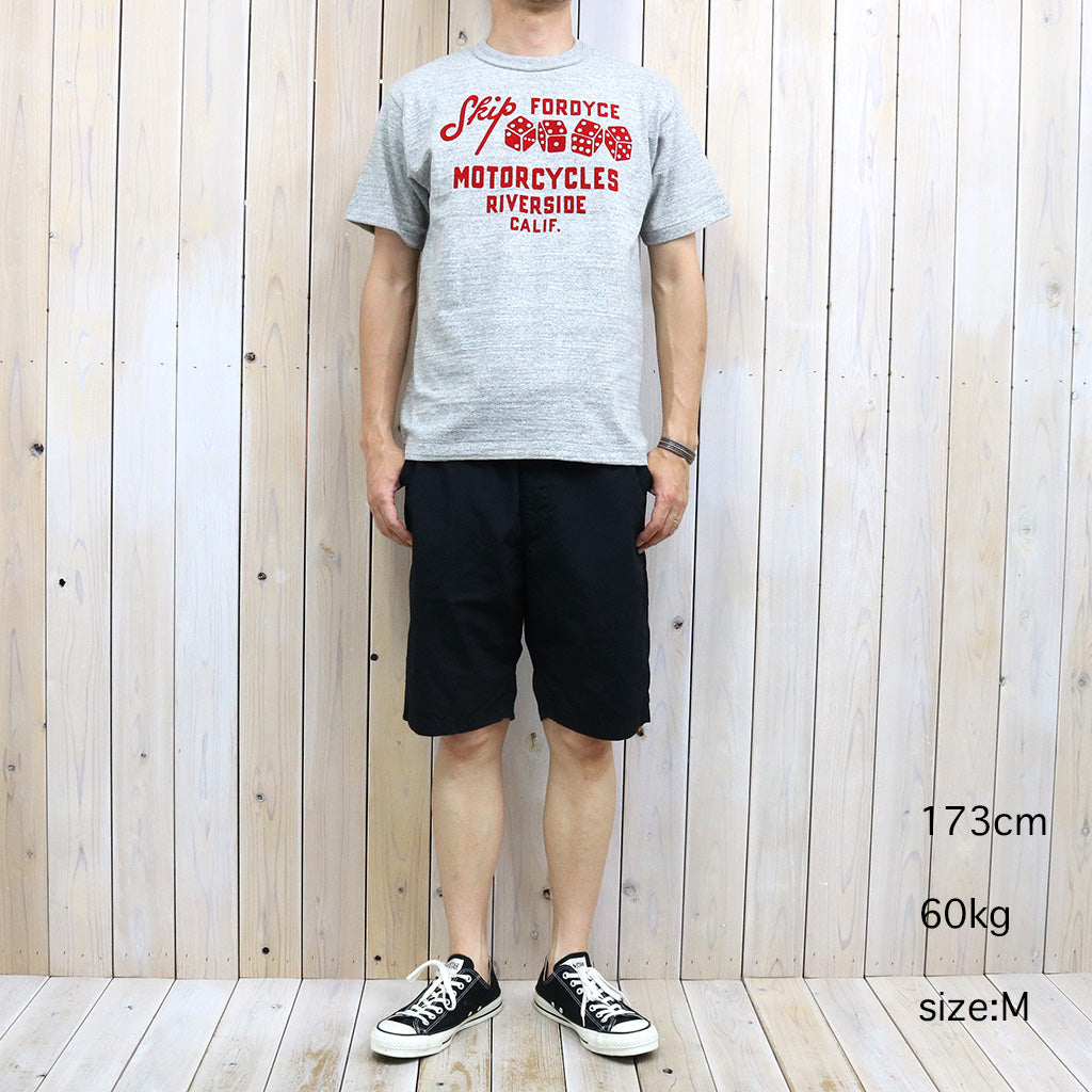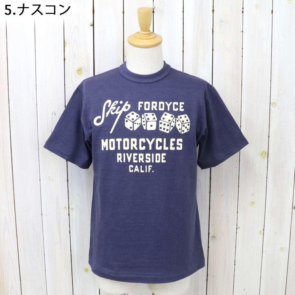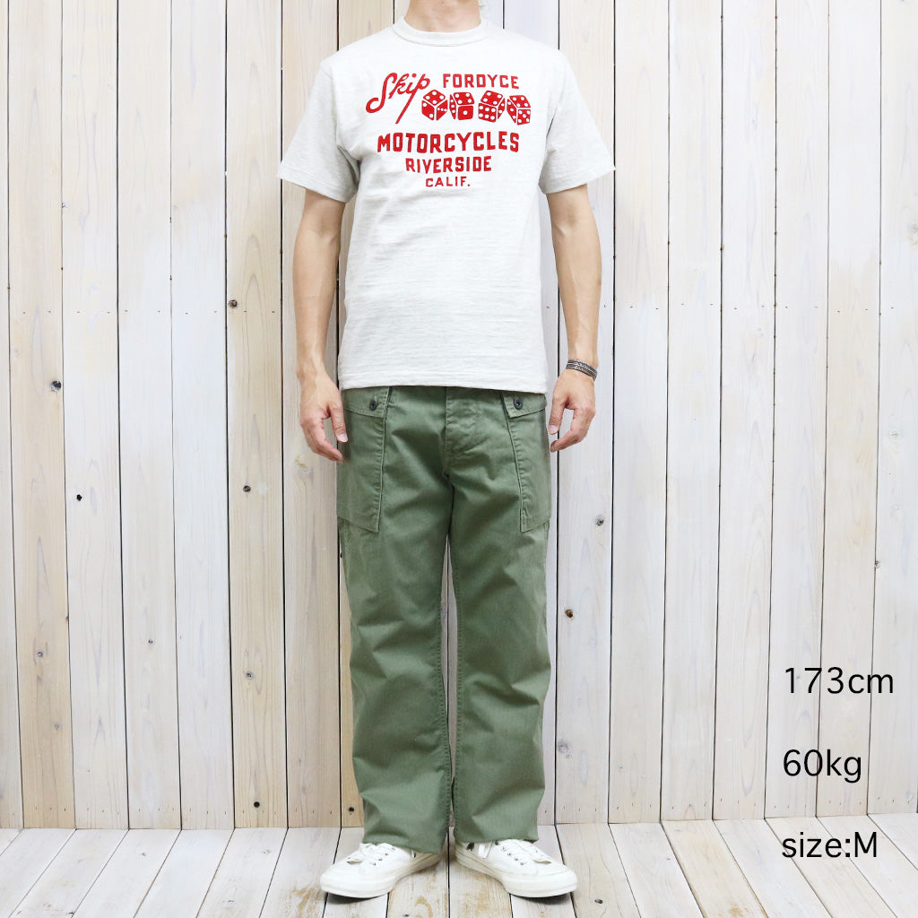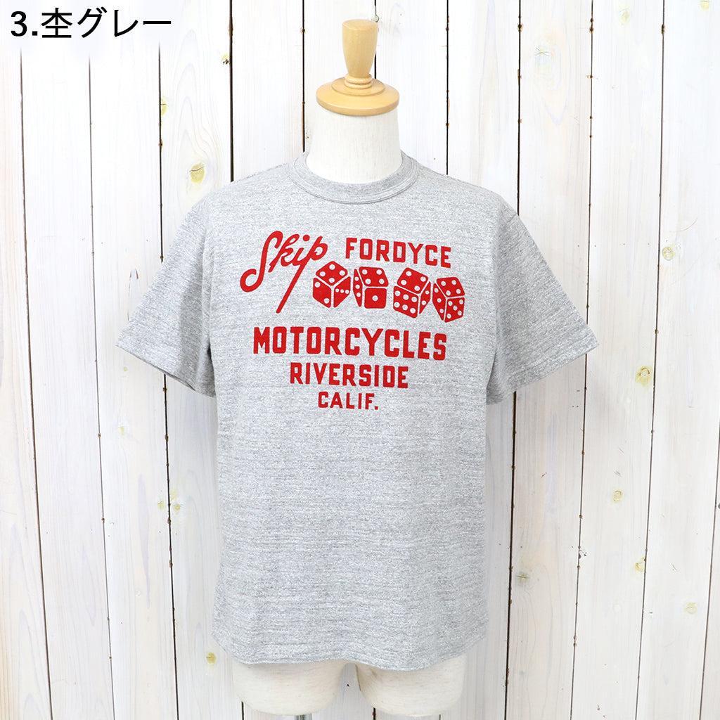「吊り編み機より希少」といわれる旧式のローゲージ編み機で編まれたウエアハウスの定番Lot 4601のプリントTシャツです。12番のムラ糸で独特の陰影が出るように編まれたこの生地はシャドウボーダーと呼ばれており、無地でありながらうっすらと横段のようなムラが浮かびます。極端に前下がりの現代的なネックラインではなく、フライスにパイピングを噛ませる事で強度を保ちながら、着込むほどにネックラインが緩み自然な前下がりが生じてきます。フロントにフロッキープリントが施されています。